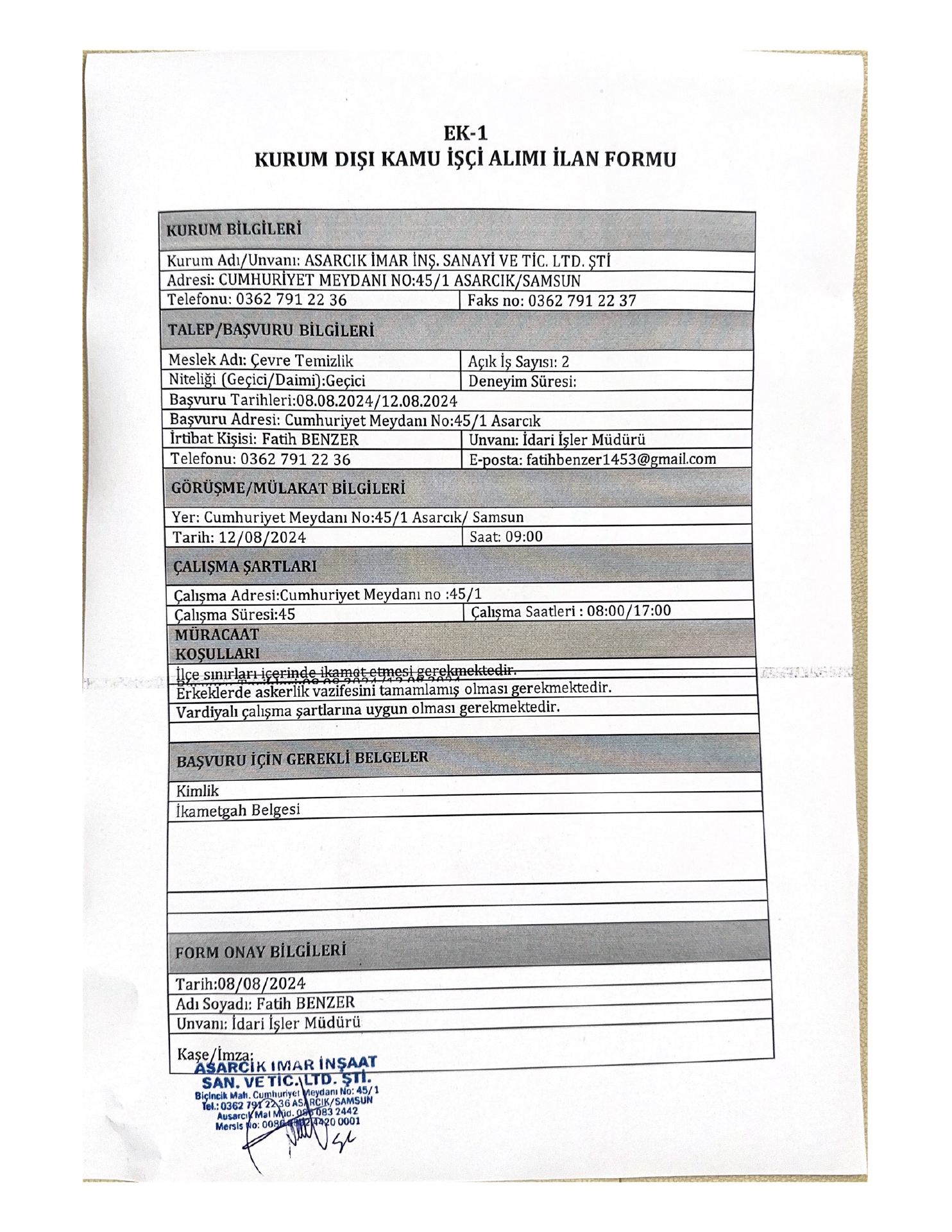 Samsun Asarcık İmar Geçici 2 İşçi Alacak. Son başvuru tarihi 12 ağustos 2024