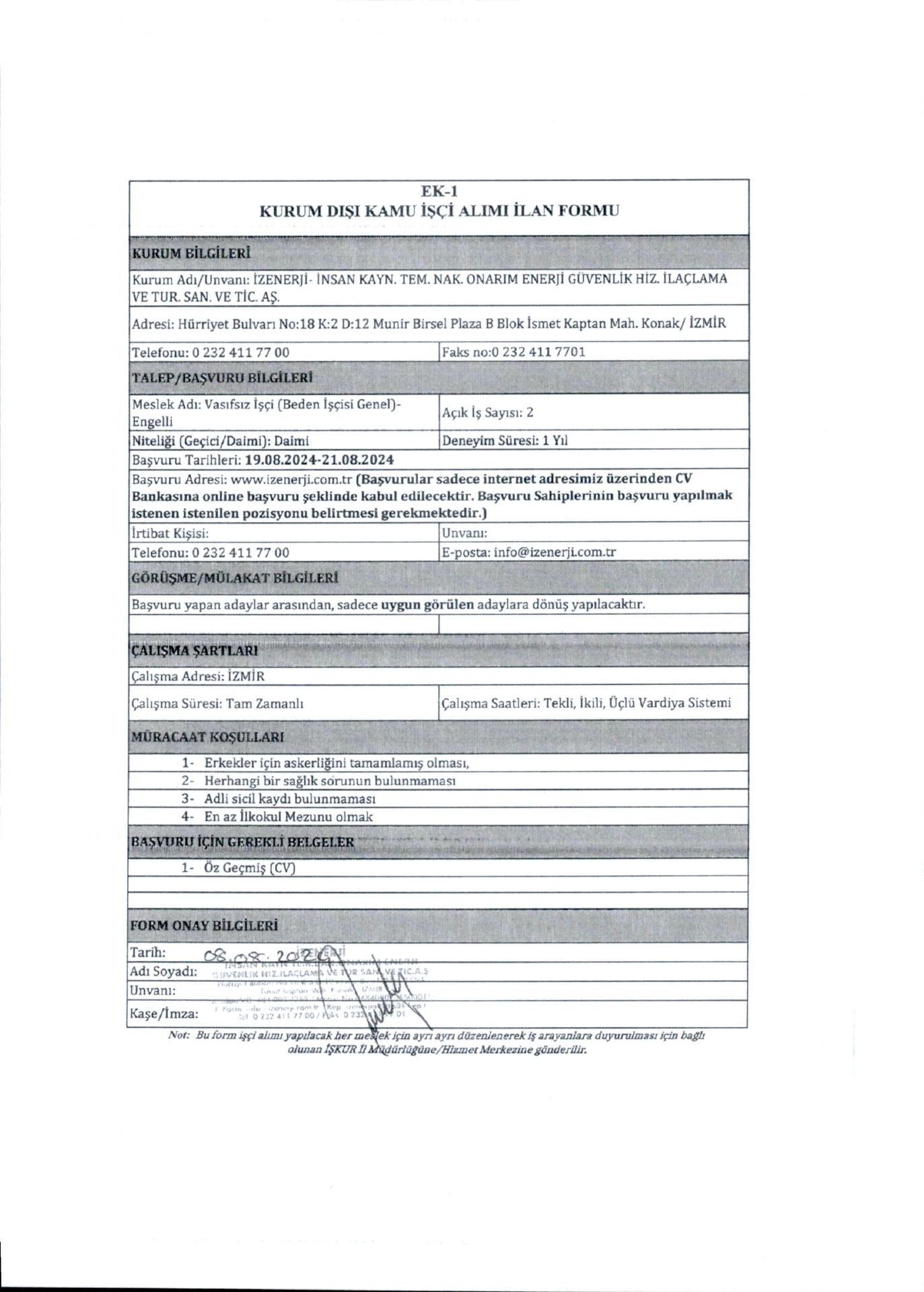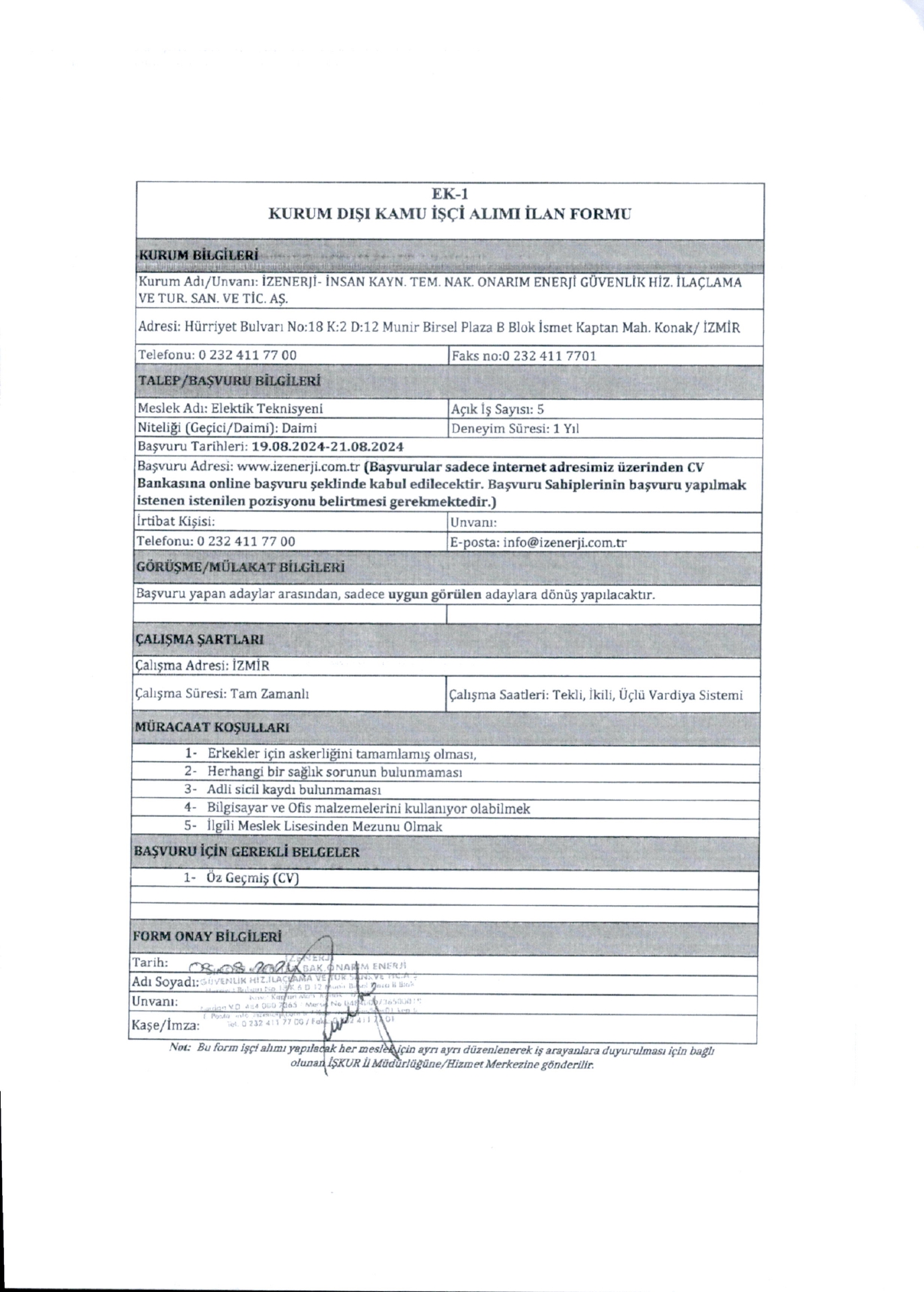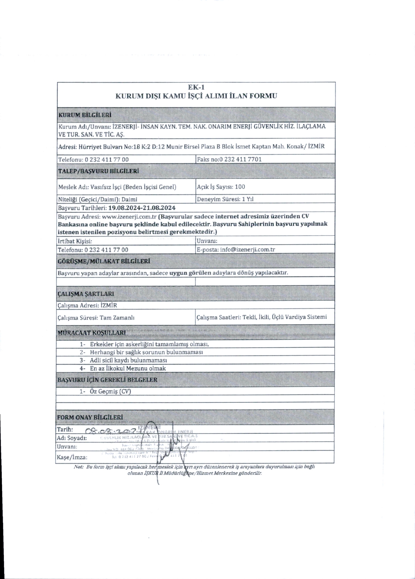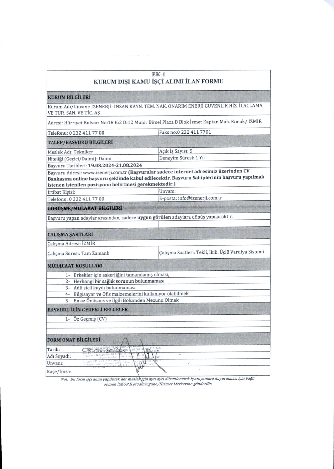 Ana sayfaDaimi İşçi İlanları İzmir İzenerji 274 İşçi Alacak İzmir İzenerji 274 İşçi Alacak. Son başvuru tarihi 21 ağustos 2024 Kaynak : işkur İlan Giriş : 08 Ağustos 2024 23:11, Son Güncelleme : 08 Ağustos 2024 23:38 Yazdır Yorumlar (0) Abone Ol <>Maaş robotuna ulaşmak için tıklayınız