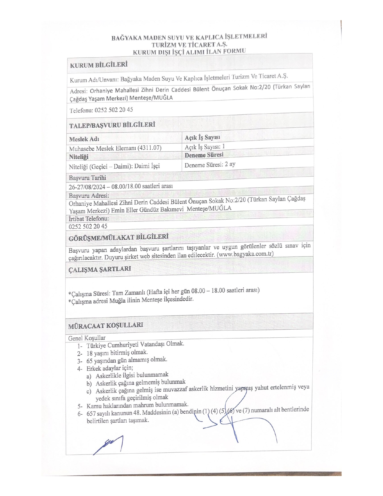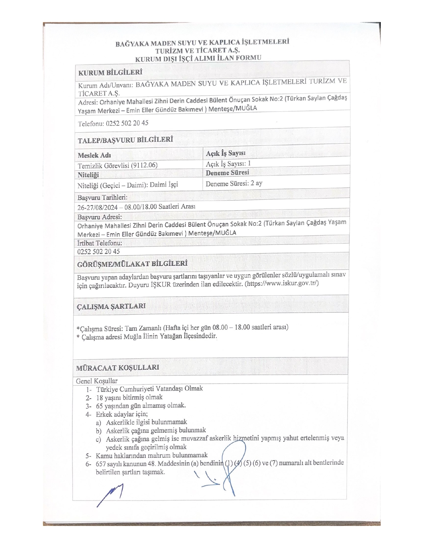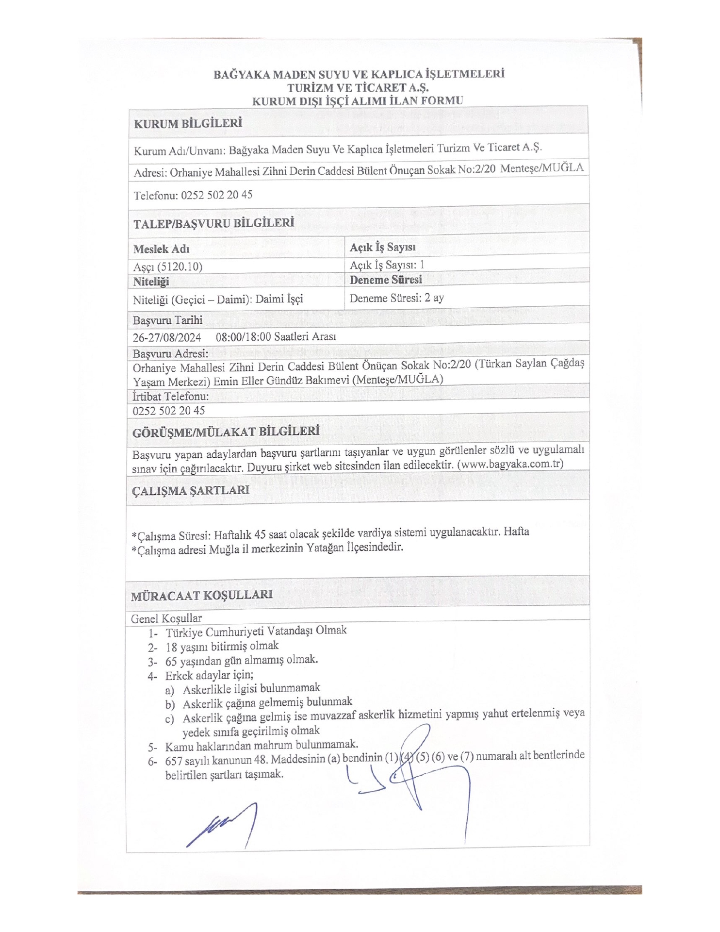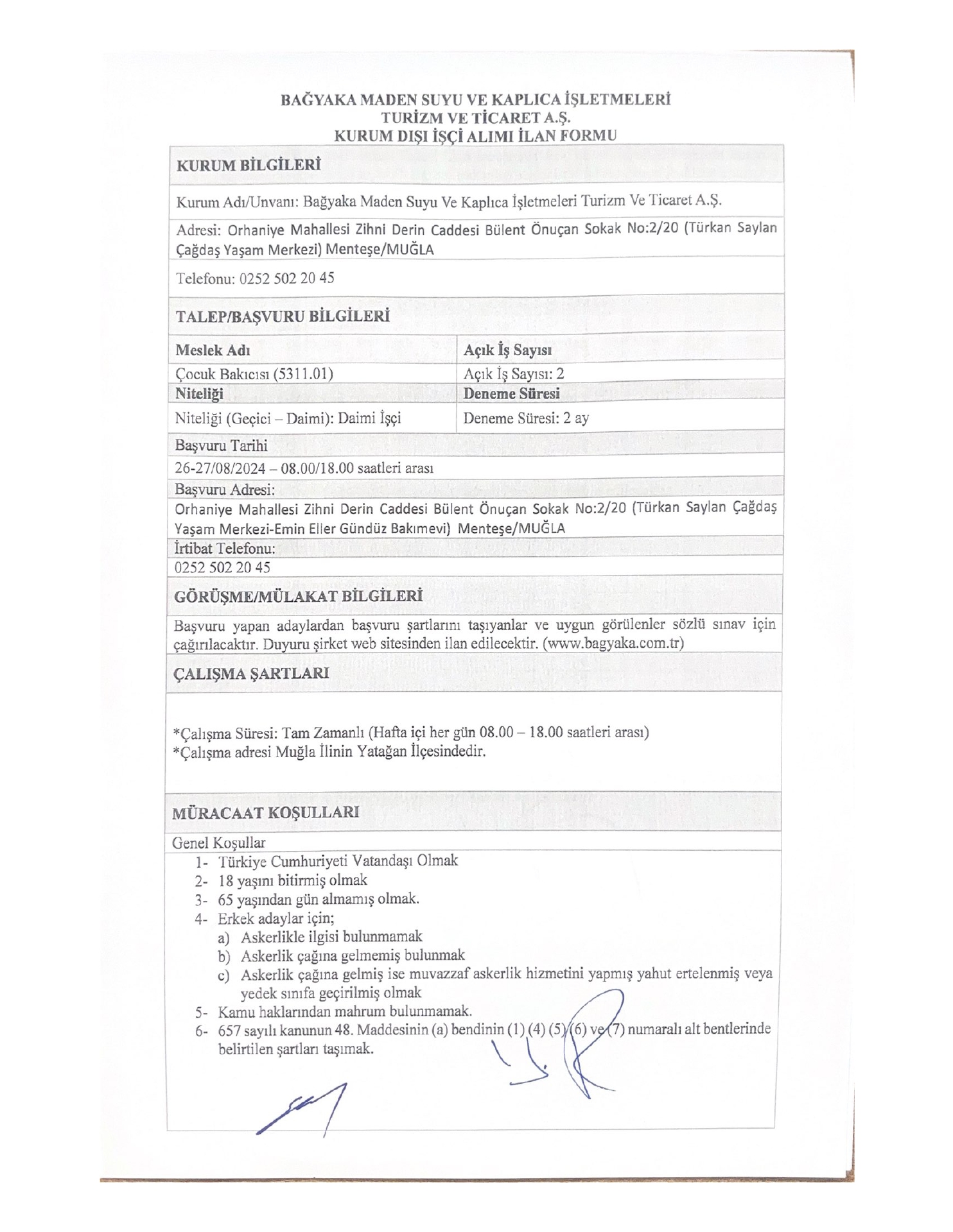 Muğla Bağyaka Maden Suyu ve Kaplıca İşletmeleri 10 İşçi Alacak. Son başvuru tarihi 27 ağustos 2024