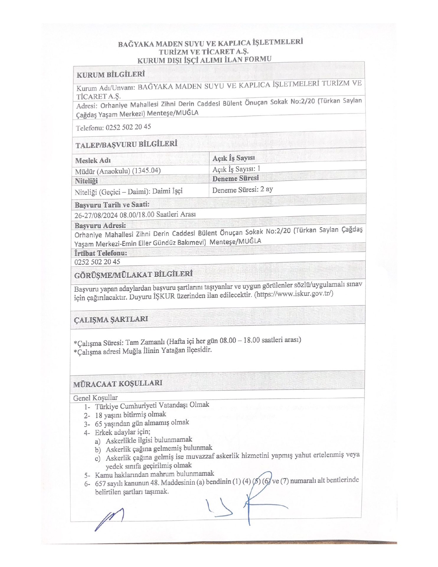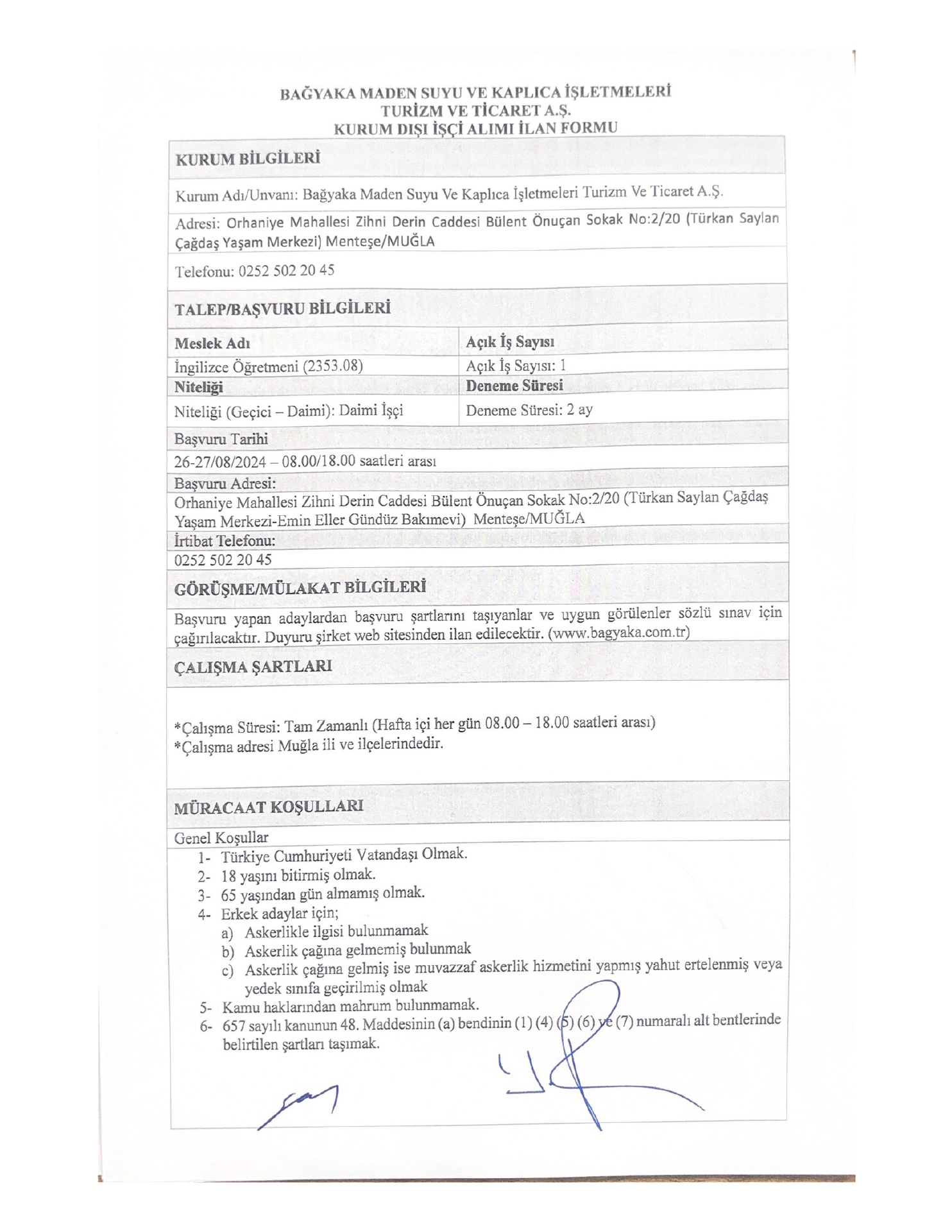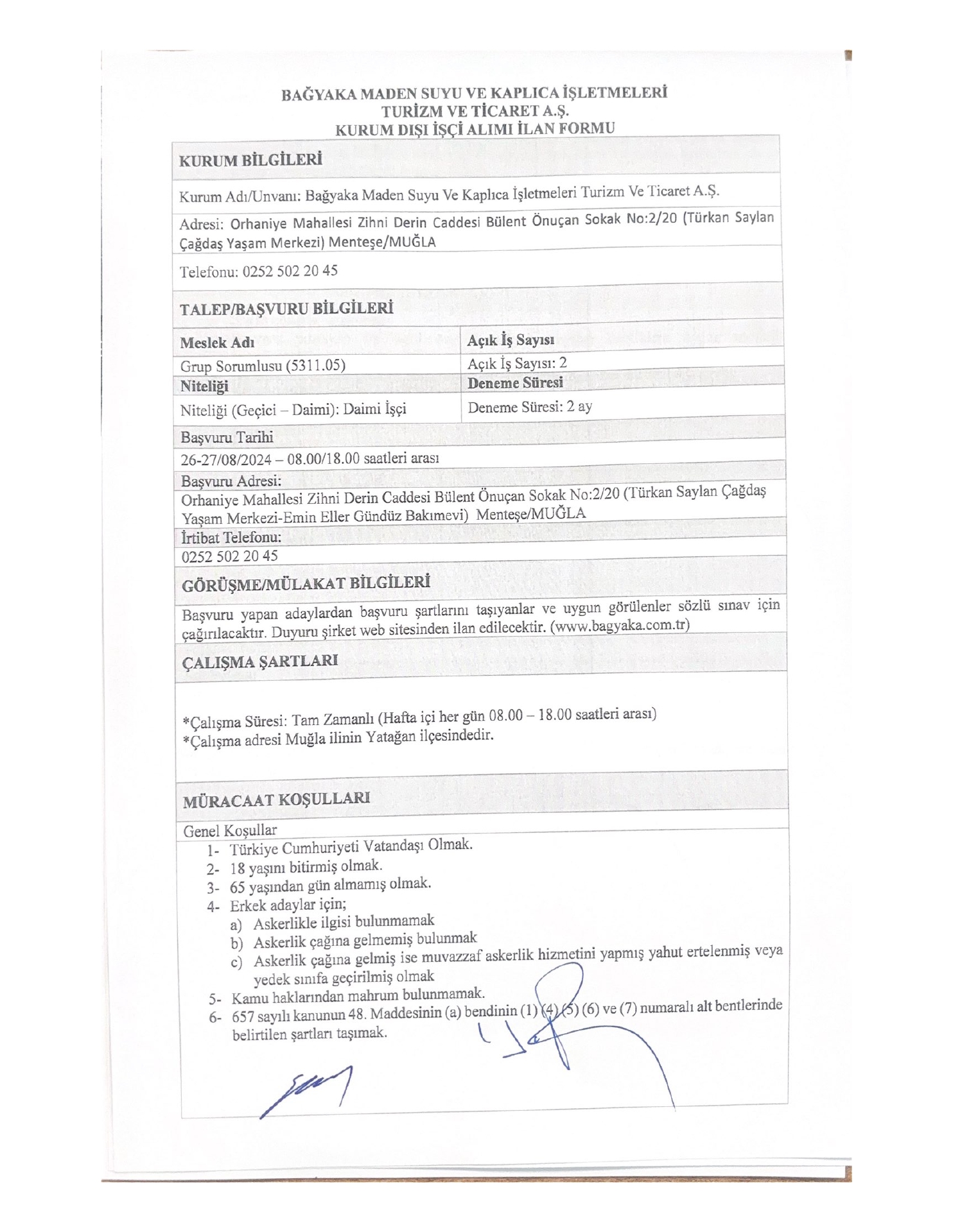 Muğla Bağyaka Maden Suyu ve Kaplıca İşletmeleri 10 İşçi Alacak. Son başvuru tarihi 27 ağustos 2024