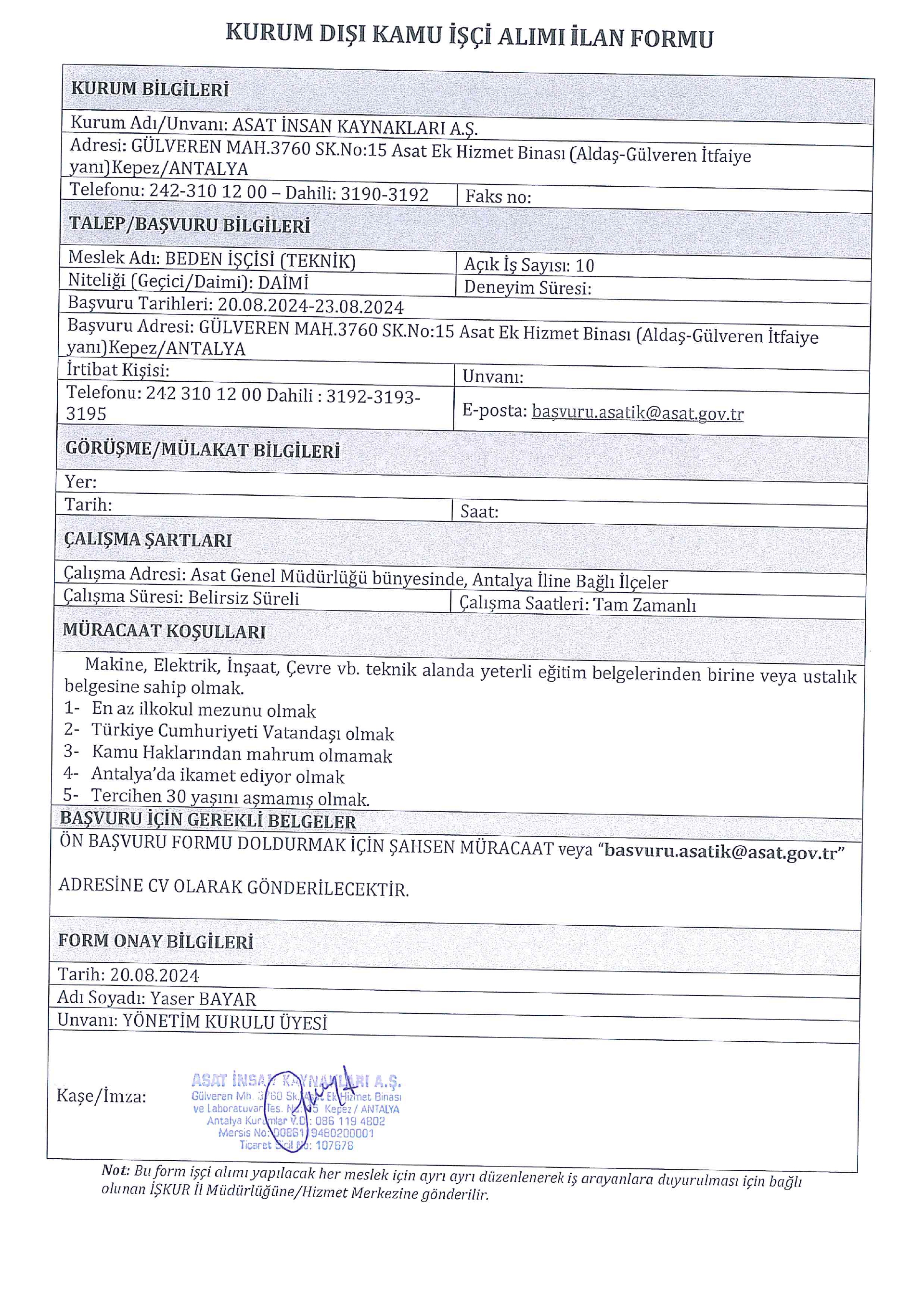Antalya Asat İnsan Kaynakları 195 İşçi Alacak. Son başvuru tarihi 23 ağustos 2024