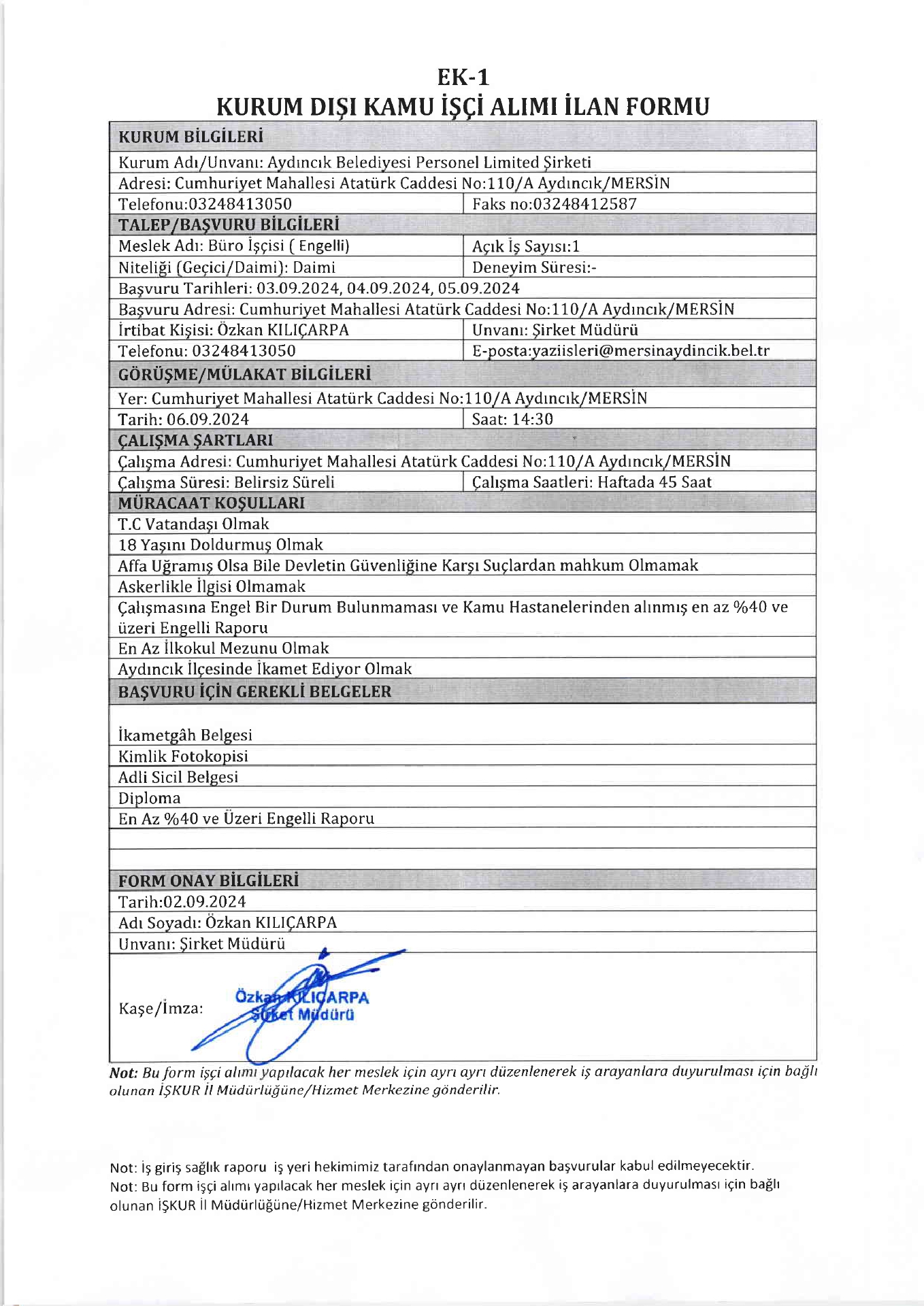 Ana sayfaDaimi İşçi İlanları Mersin Aydıncık Belediyesi 1 İşçi Alacak Mersin Aydıncık Belediyesi 1 İşçi Alacak. Son başvuru tarihi 5 eylül 2024 Kaynak : işkur İlan Giriş : 04 Eylül 2024 00:19, Son Güncelleme : 04 Eylül 2024 02:53 Yazdır Yorumlar (0) Abone Ol <>Maaş robotuna ulaşmak için tıklayınız