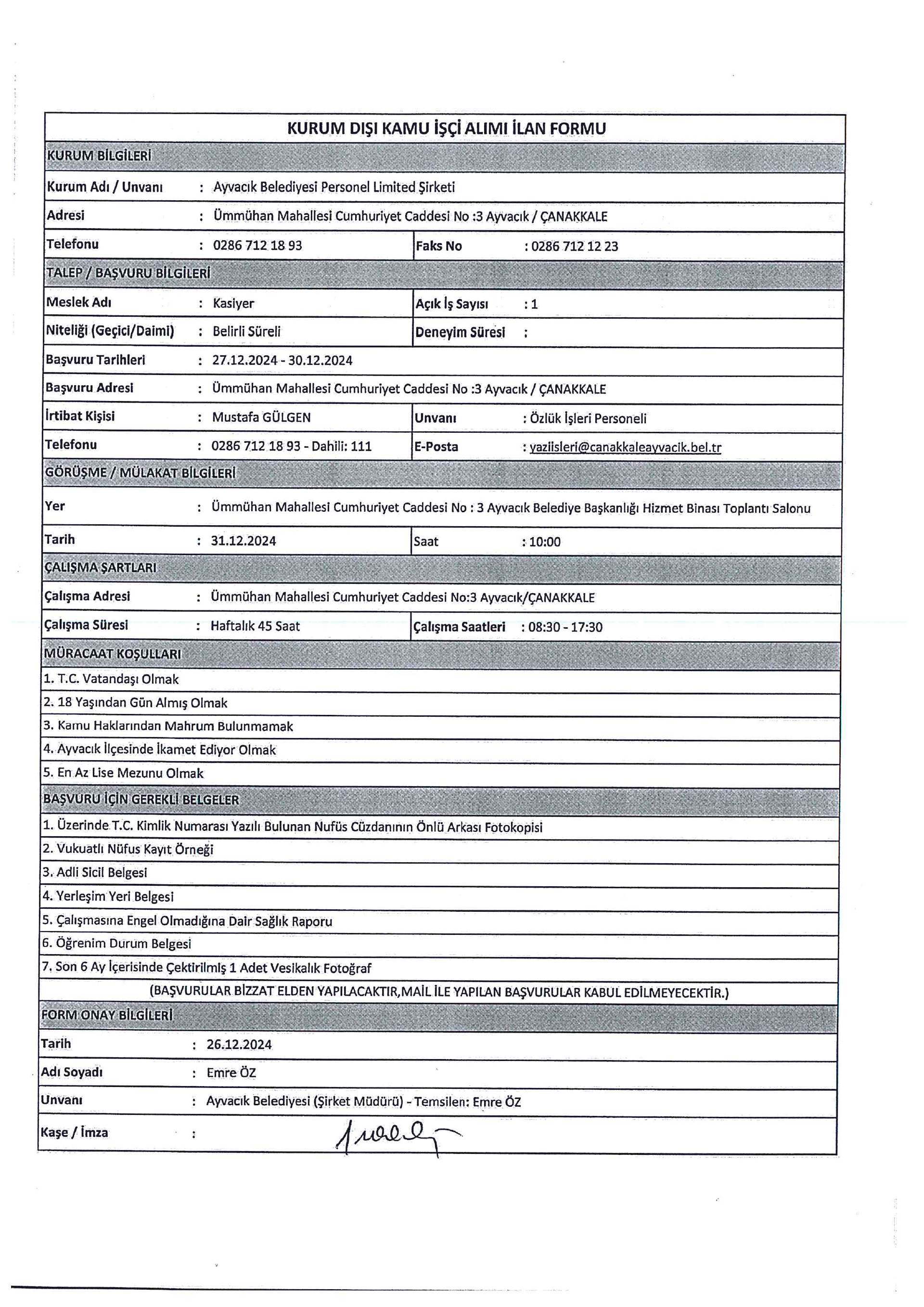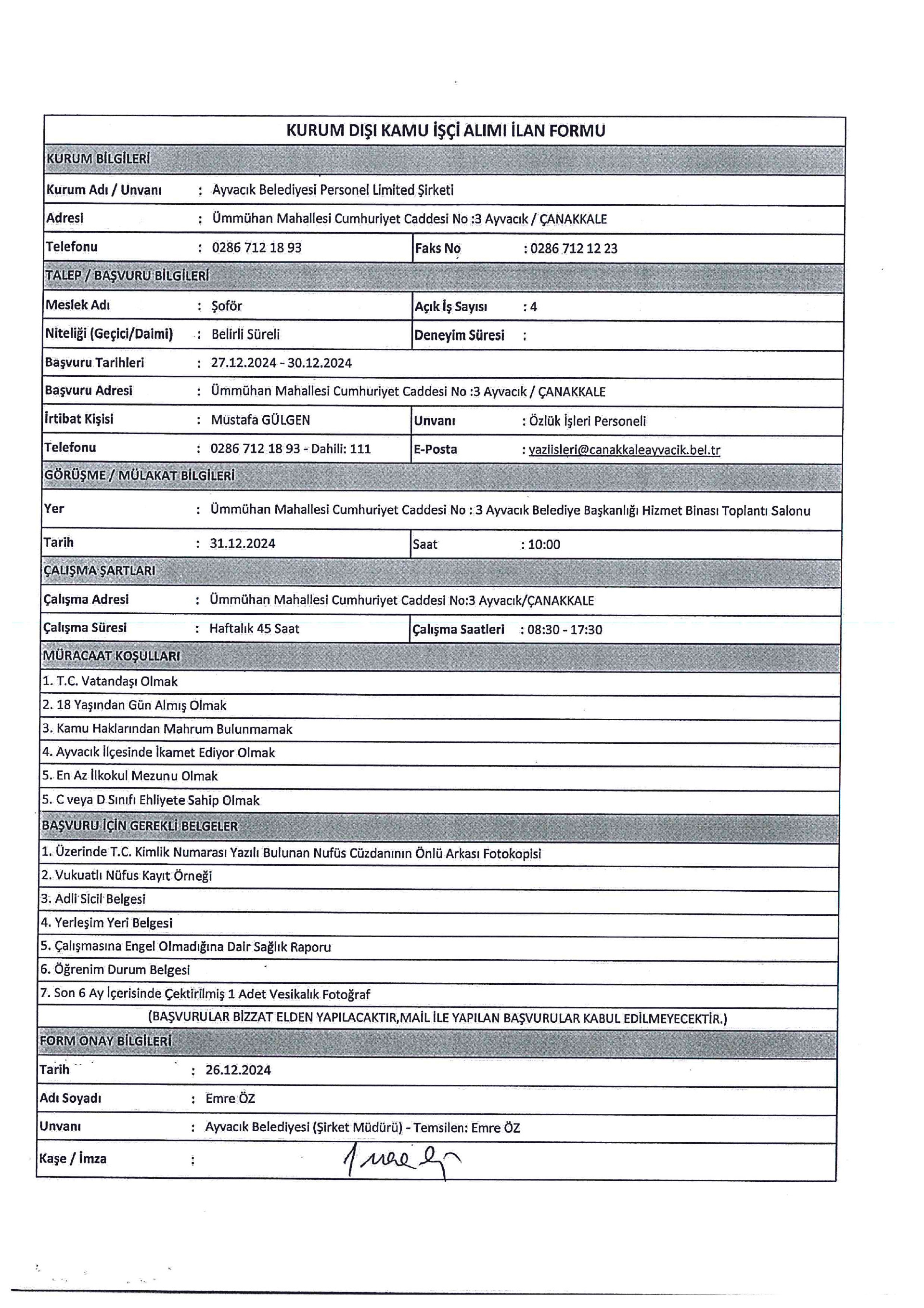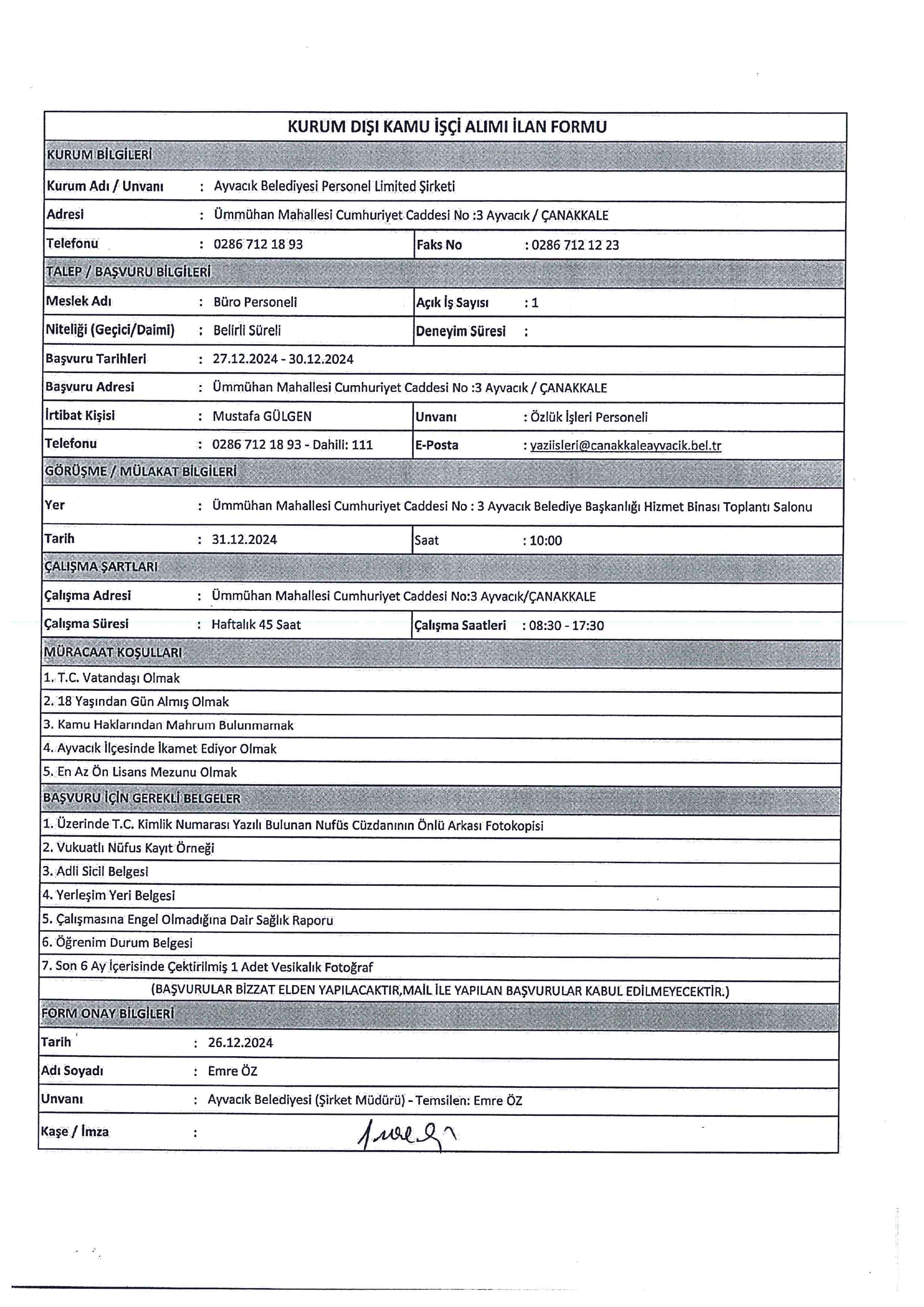 Çanakkale Ayvacık Belediyesi 22 İşçi Alacak. Son başvuru tarihi 30 aralık 2024