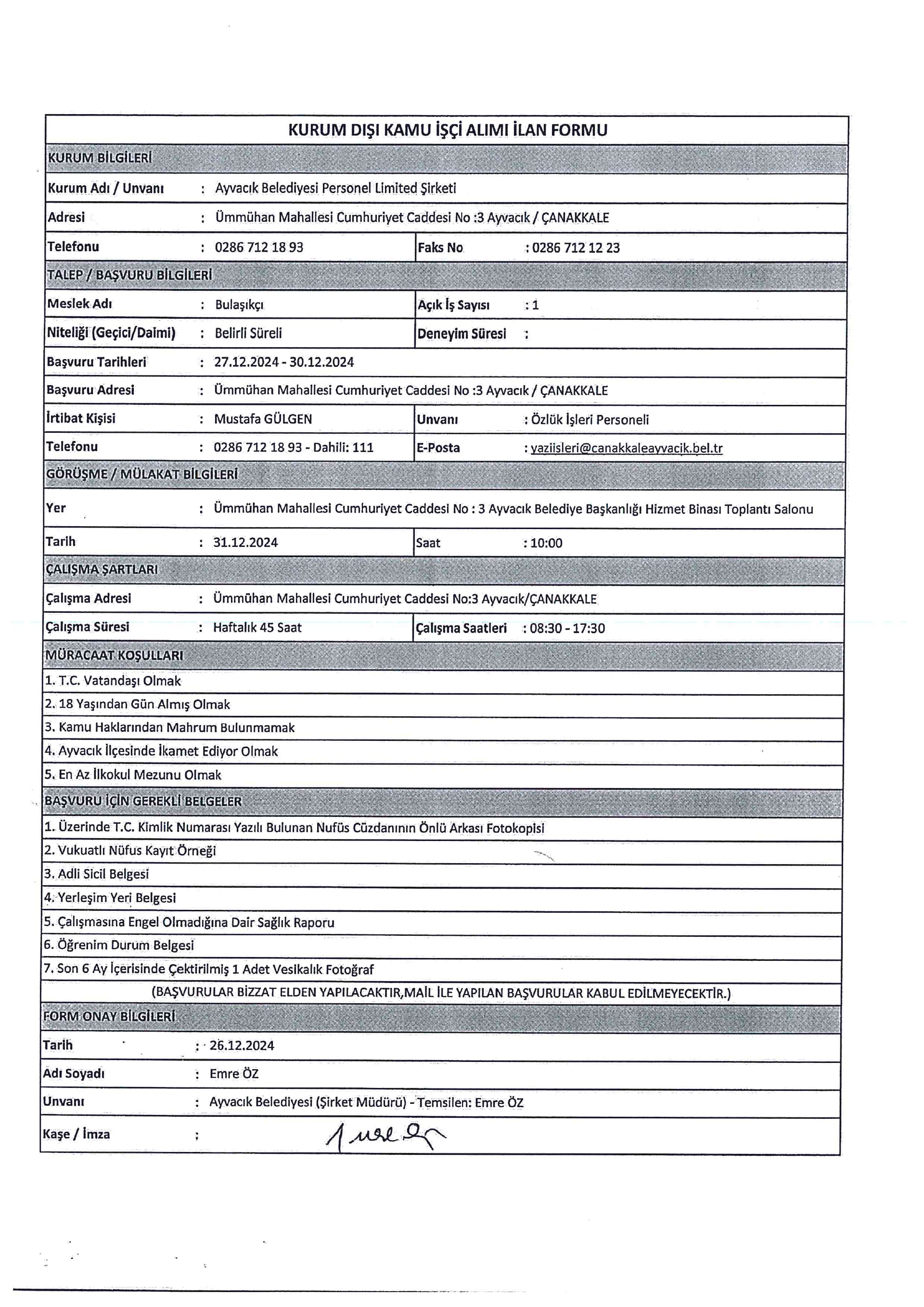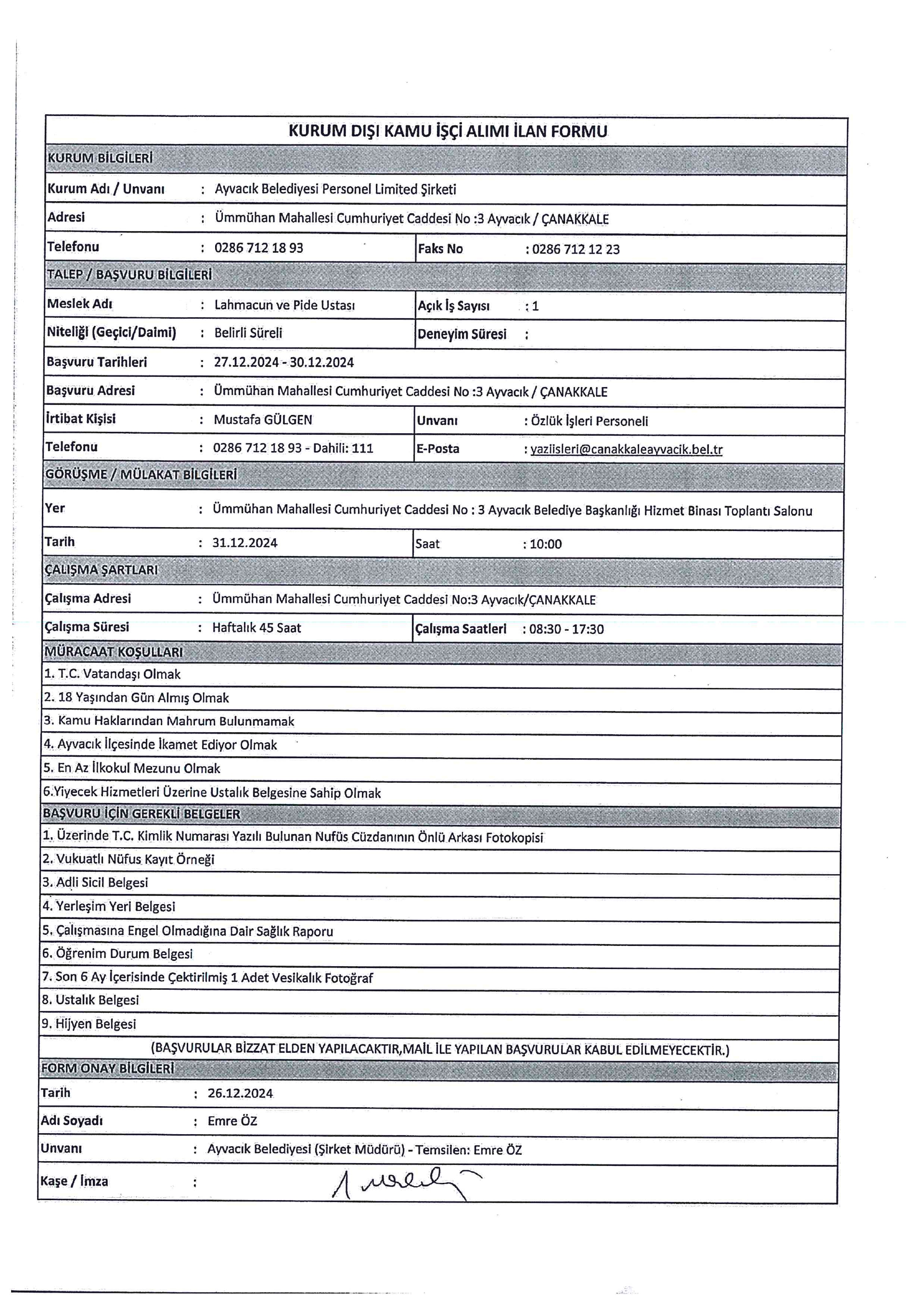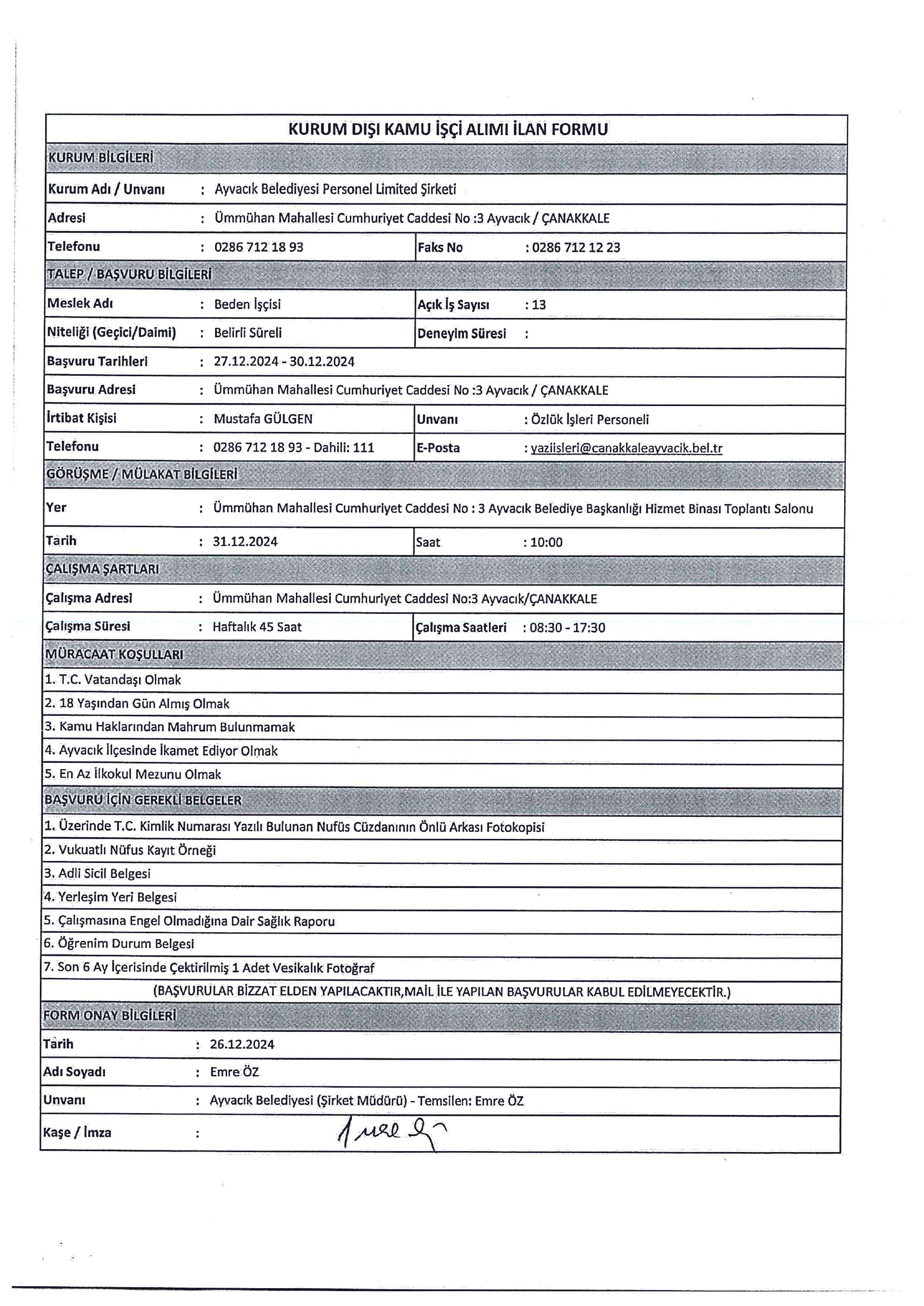Çanakkale Ayvacık Belediyesi 22 İşçi Alacak. Son başvuru tarihi 30 aralık 2024