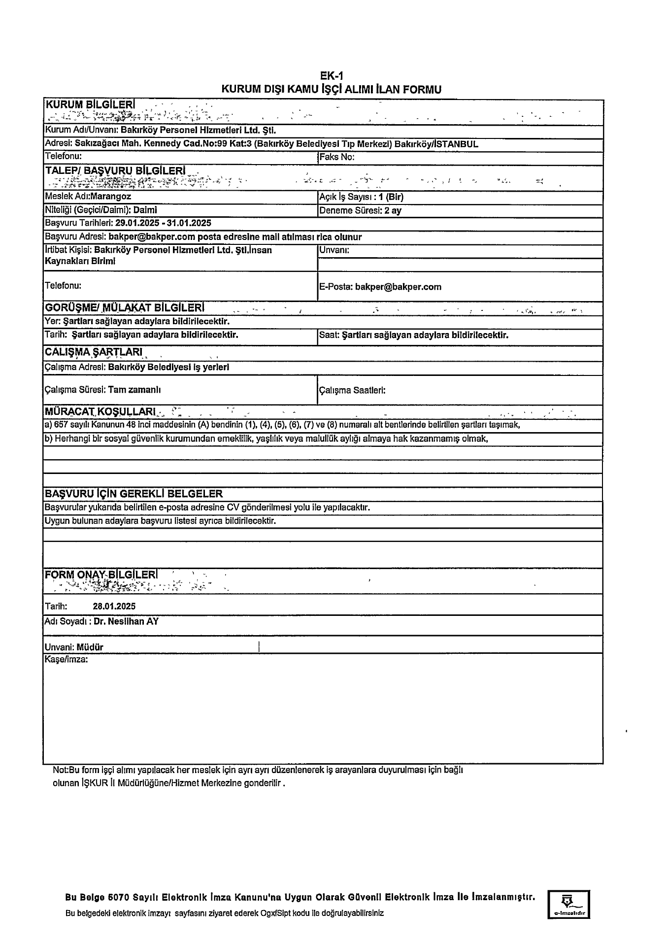 İstanbul Bakırköy Personel Aş. 1 İşçi Alacak. Son başvuru tarihi 31 ocak 2025