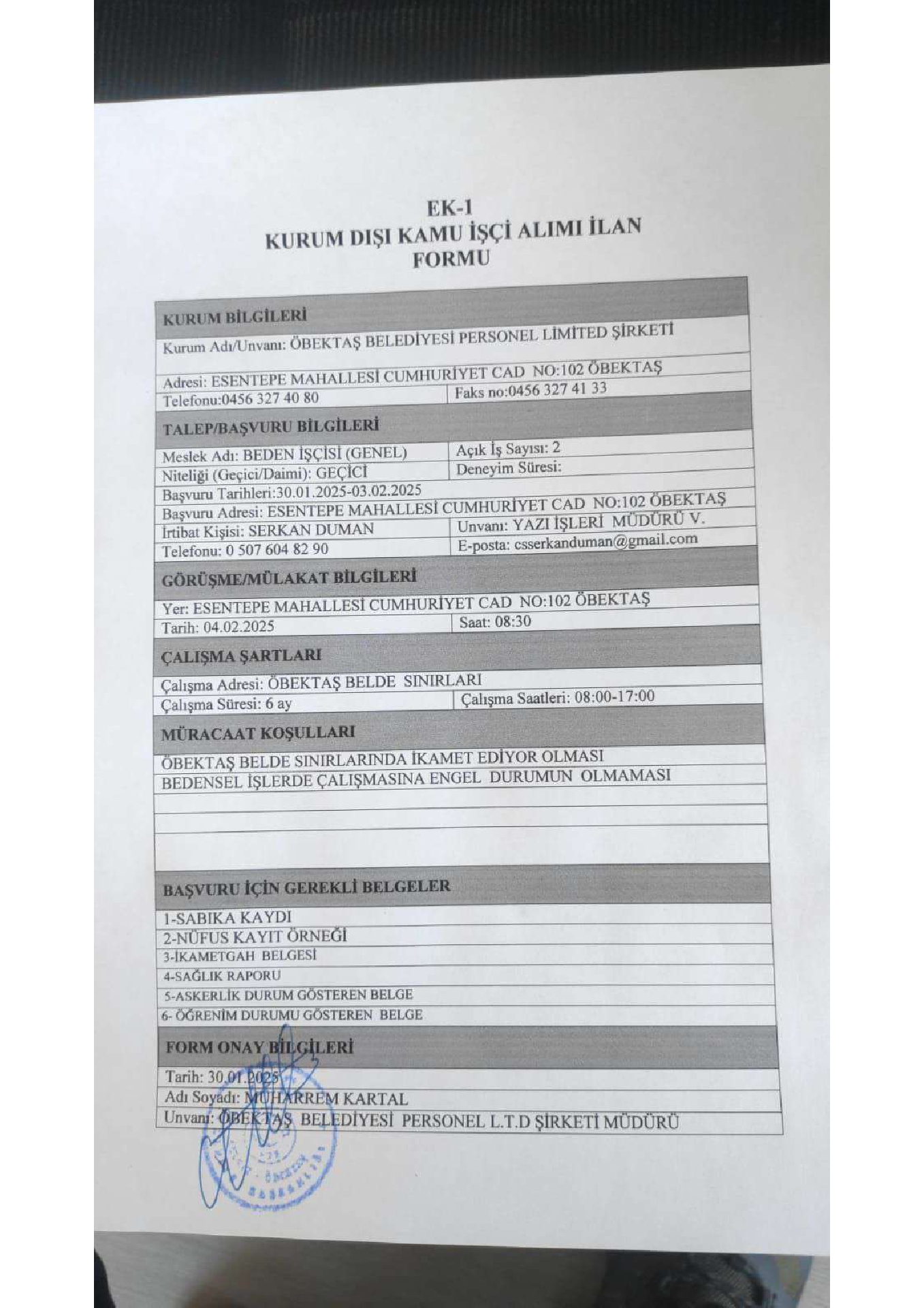 Öbektaş Belediyesi Geçici 2 İşçi Alacak. Son başvuru tarihi 3 Şubat 2025
