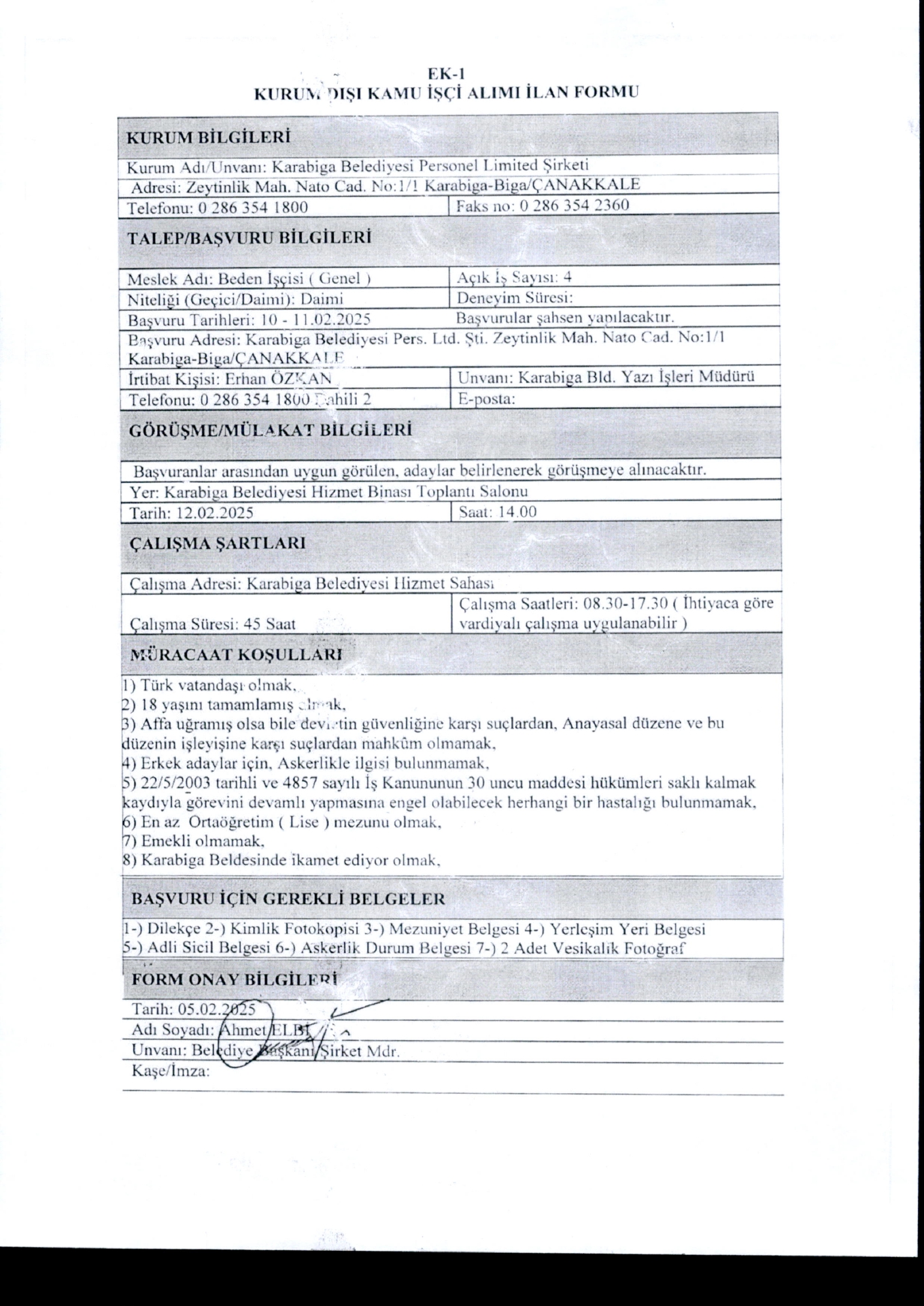 Çanakkale Karabiga Belediyesi 4 İşçi Alacak. Son başvuru tarihi 11 şubat 2025