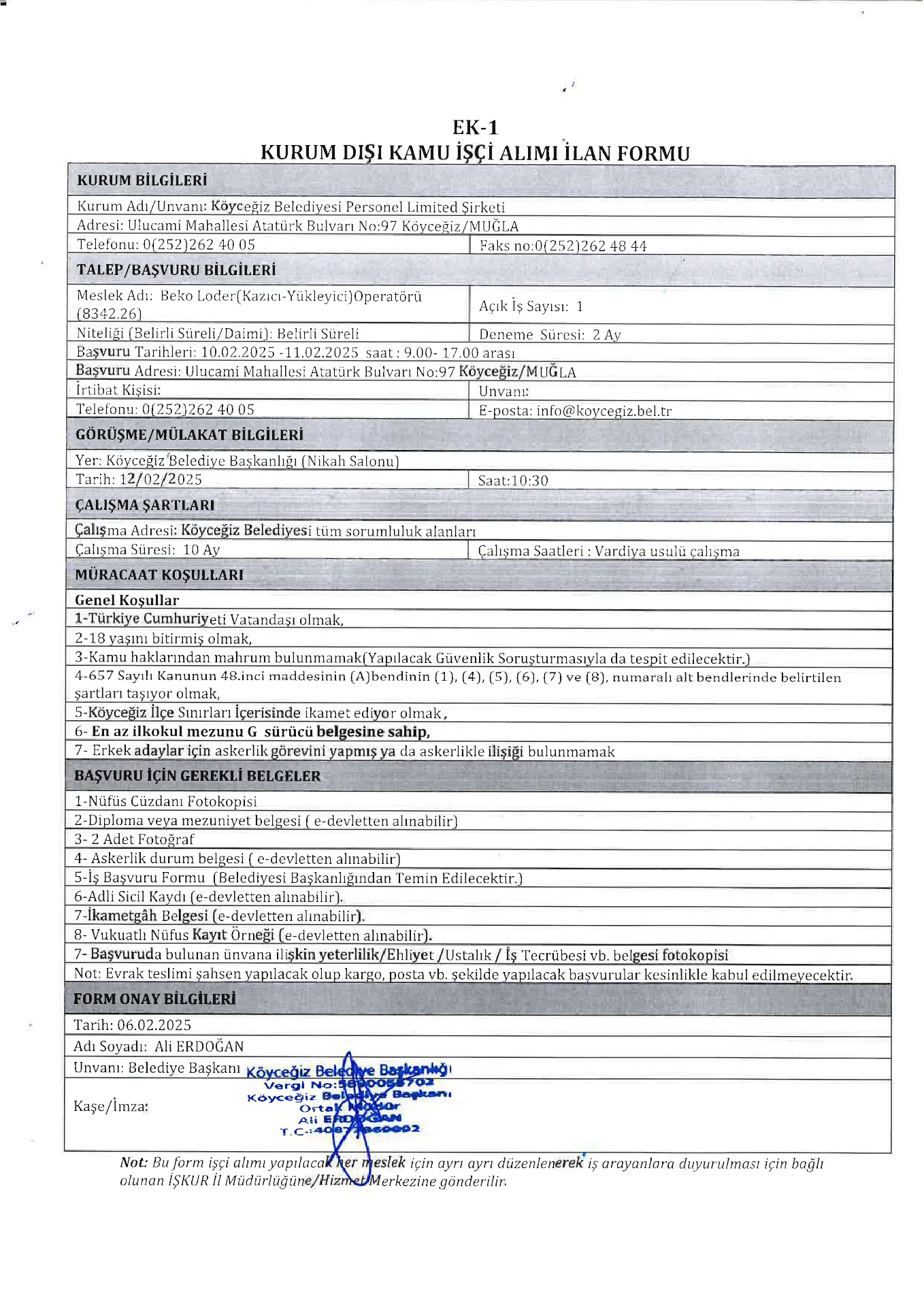 Muğla Köyceğiz Belediyesi Geçici 1 İşçi Alacak. Son başvuru tarihi 11 şubat 2025