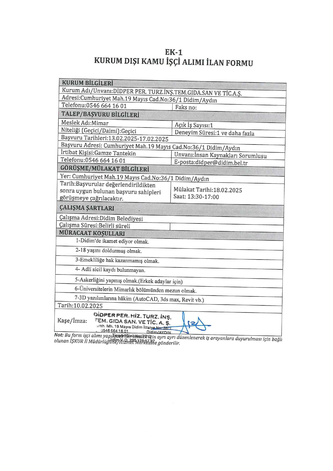 Aydın Didim Didper Geçici 1 İşçi Alacak. Son başvuru tarihi 17 şubat 2025