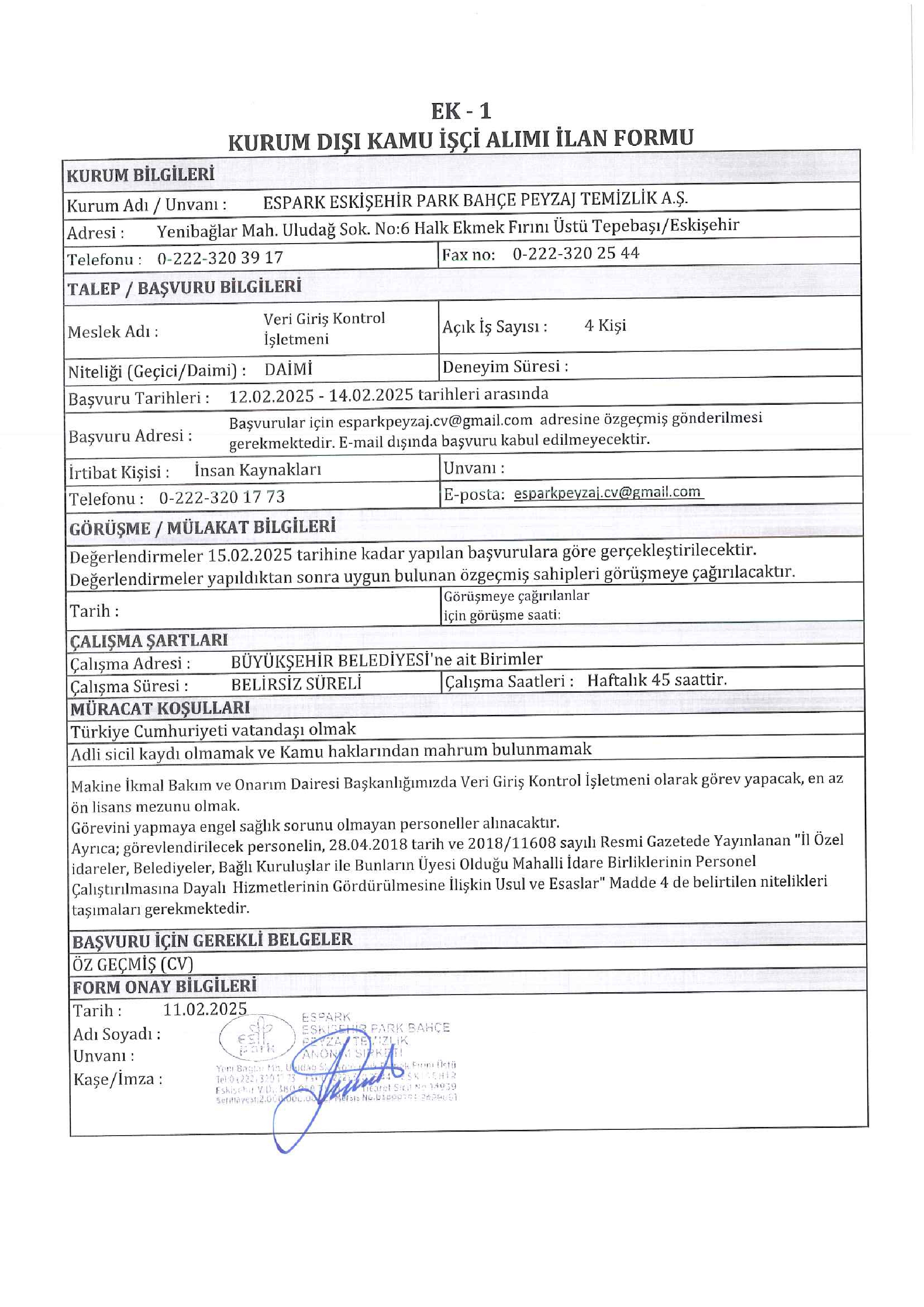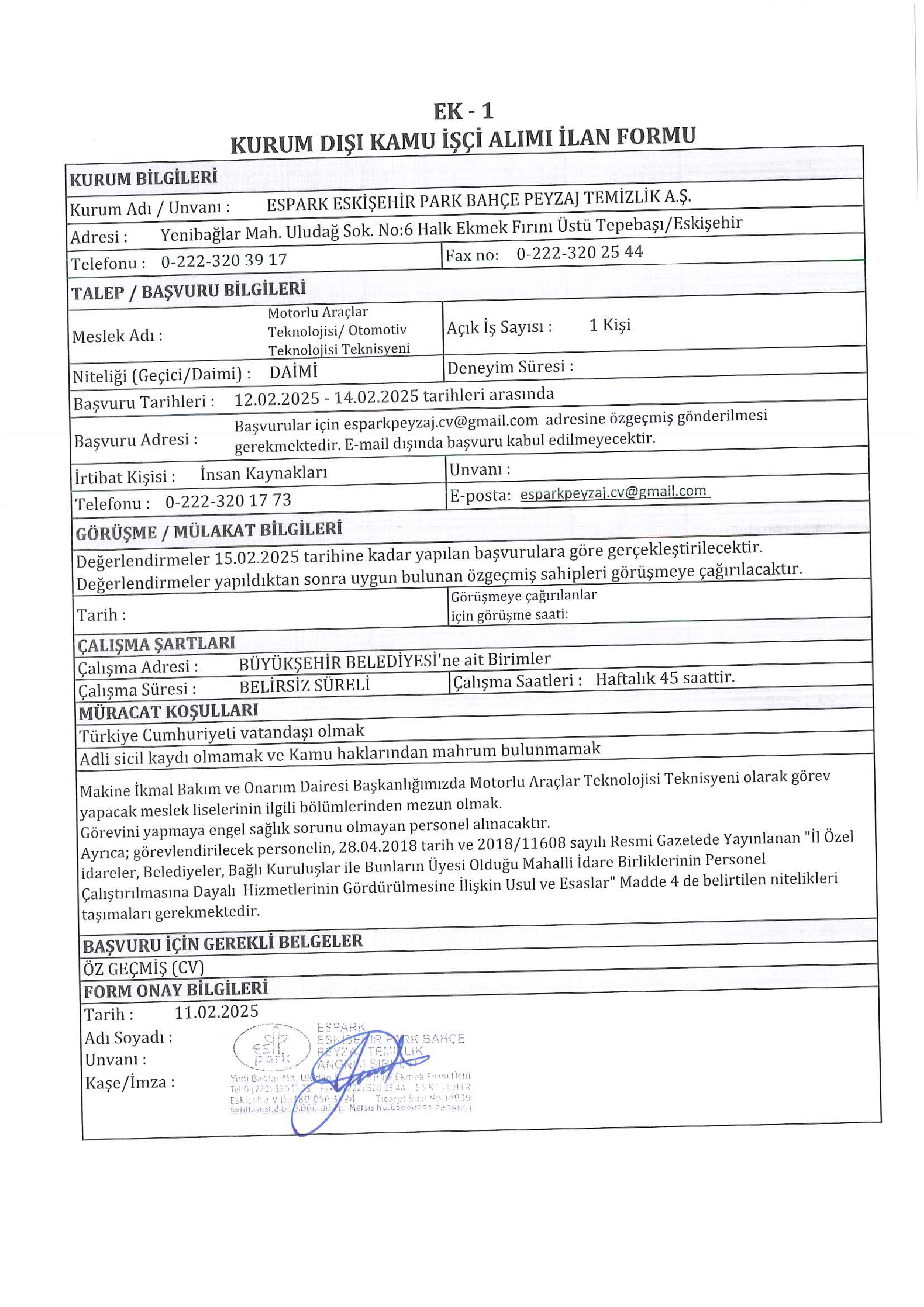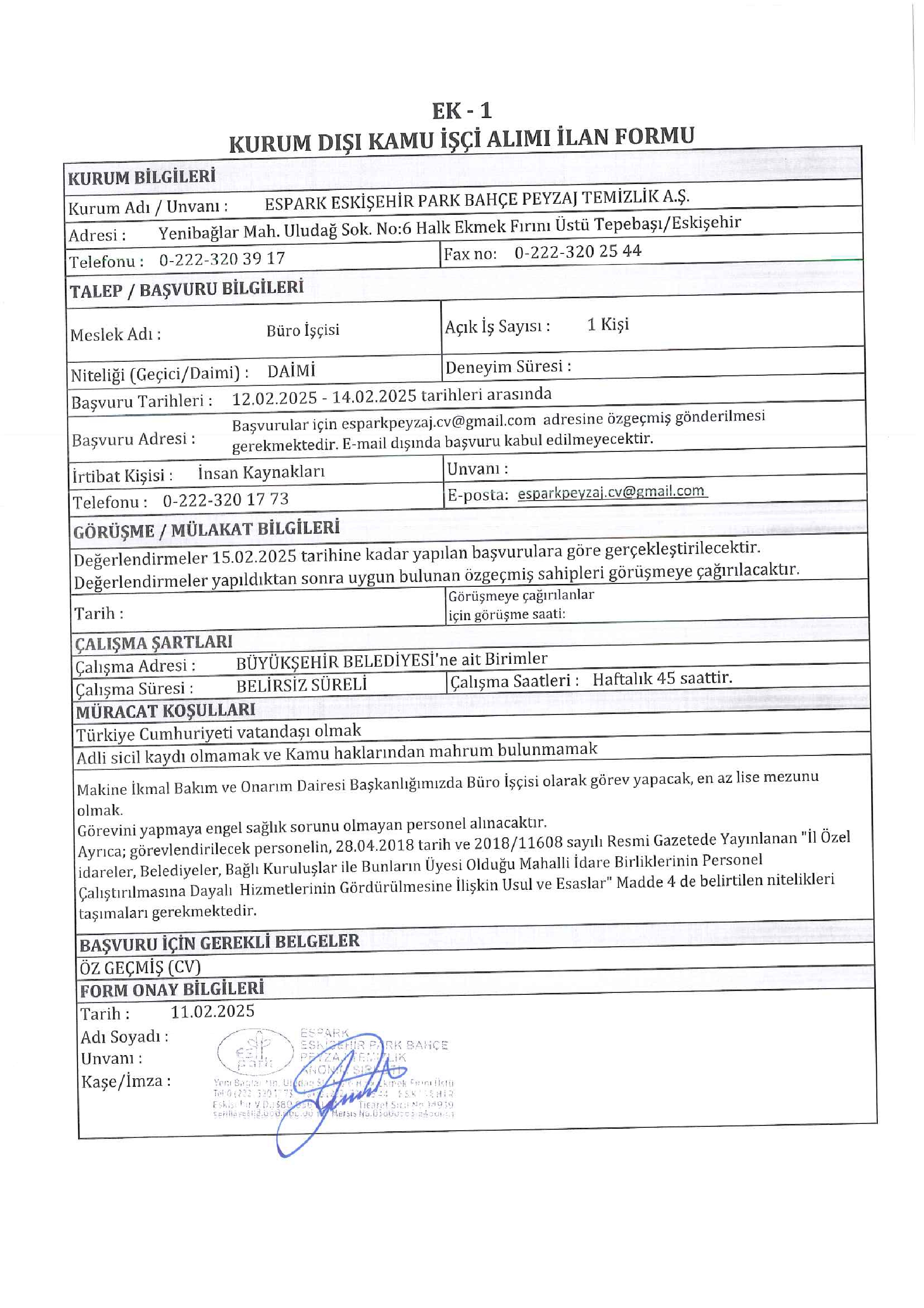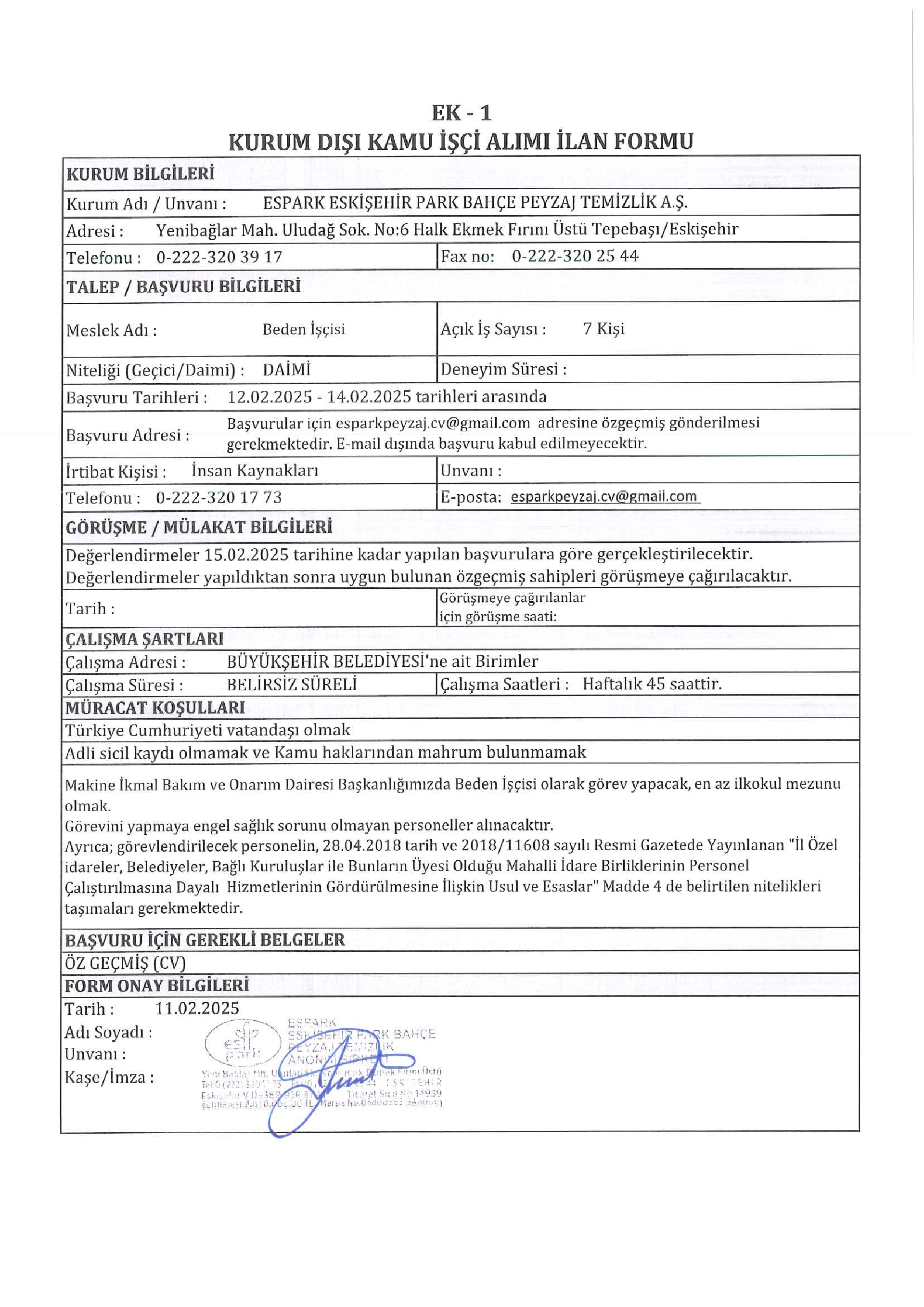 Eskişehir Espark 13 İşçi Alacak. Son başvuru tarihi 14 şubat 2025