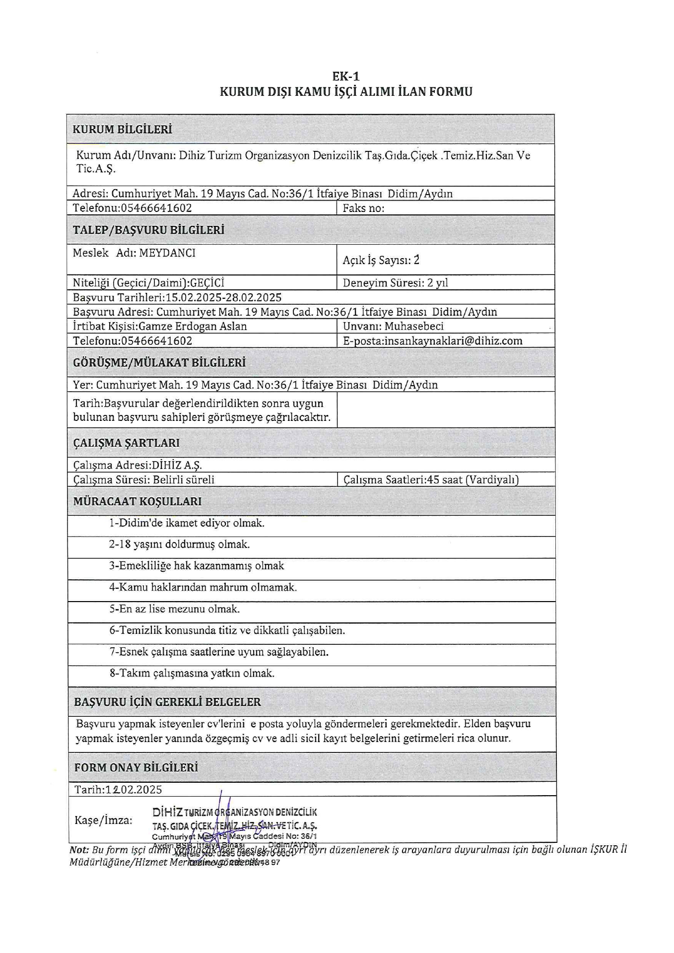 Aydın Dihiz Turizm Geçici 1 İşçi Alacak. Son başvuru tarihi 28 şubat 2025