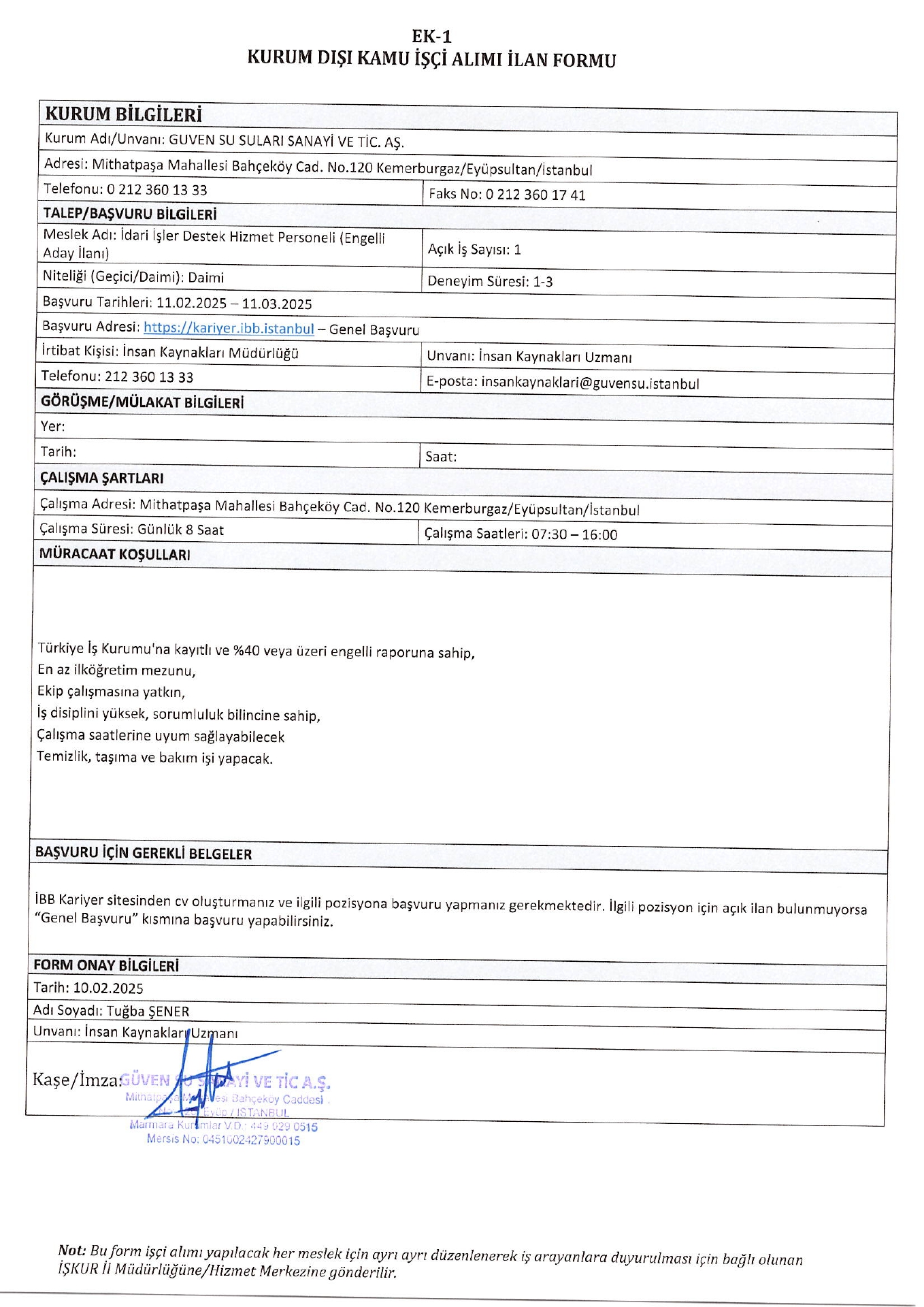 İstanbul Güven Su 1 İşçi Alacak