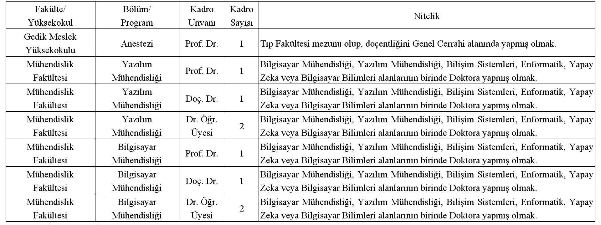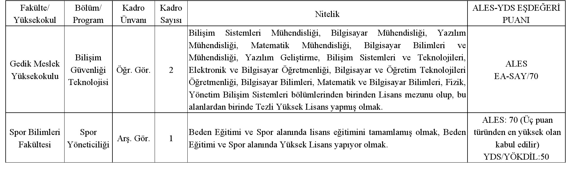 Üniversitemize 2547 sayılı Yükseköğretim Kanunu'nun ve Öğretim Üyesi Dışındaki Öğretim Elemanı Kadrolarına Yapılacak Atamalarda uygulanacak Merkezi Sınav ile Giriş Sınavlarına İlişkin Usul ve Esaslar Hakkında Yönetmelik gereğince öngörülen koşulları sağlamış olmak şartı ile aşağıda belirtilen kadrolara öğretim elemanı alınacaktır.