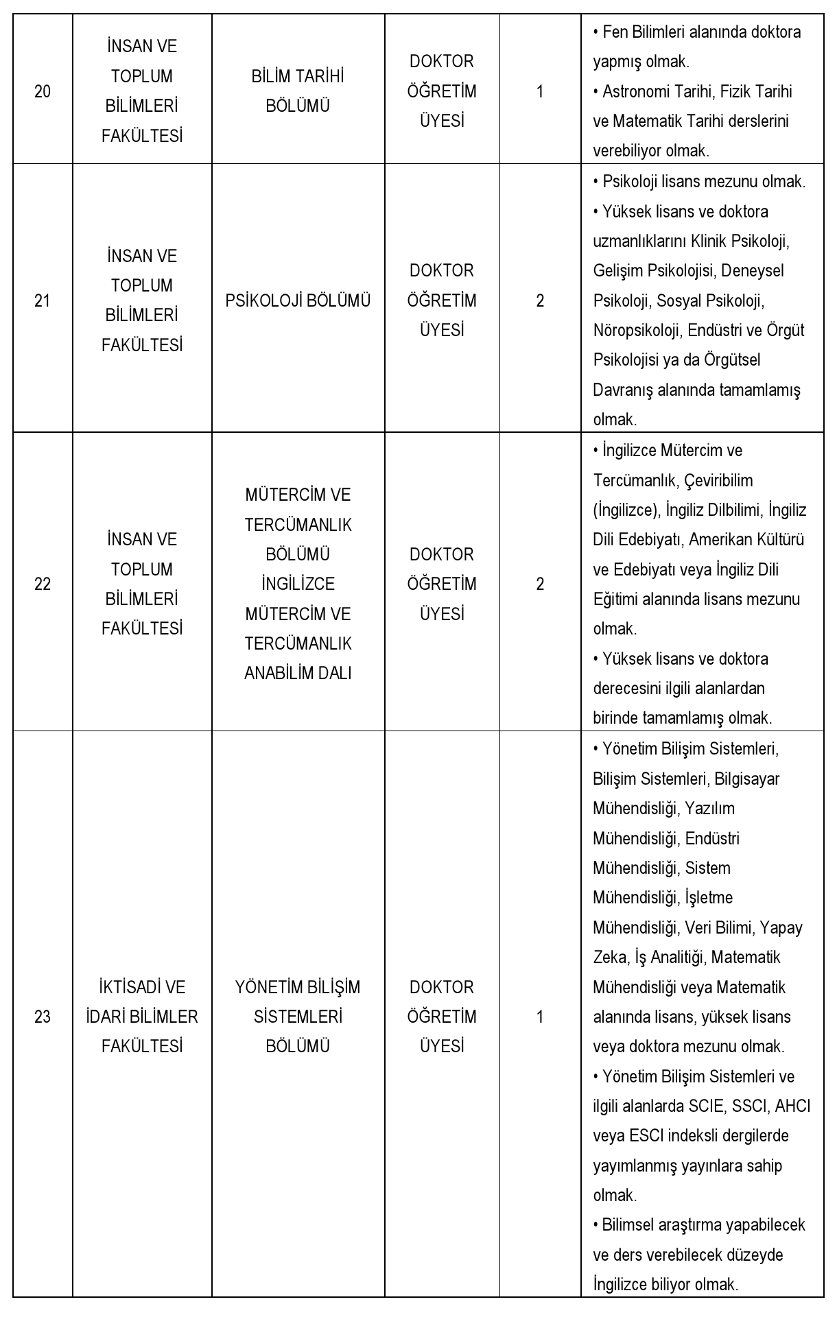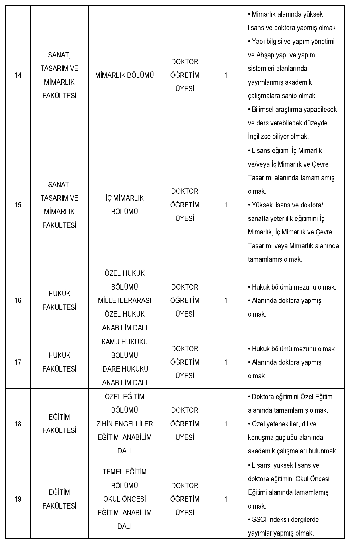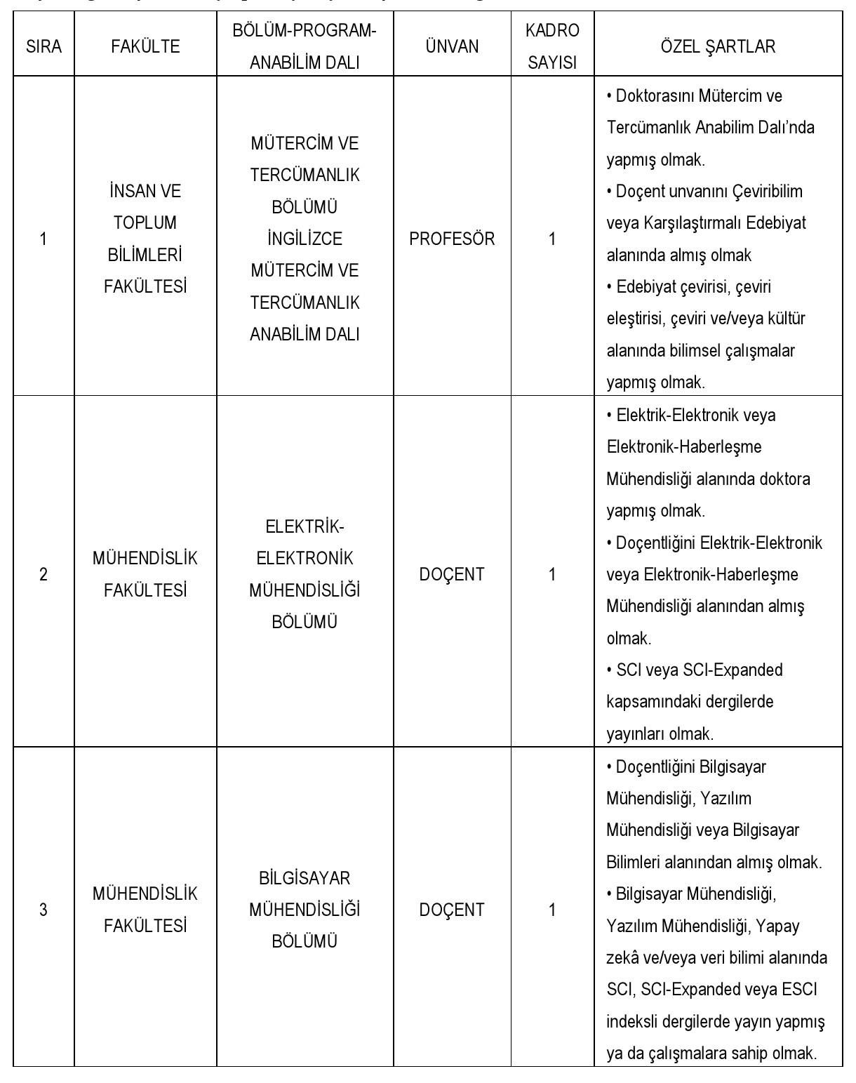 Üniversitemiz aşağıda belirtilen birimlere 2547 sayılı Kanun'un 23., 24. ve 26. maddeleri ile 28.01.1982 tarihli Resmi Gazete'de yayınlanan Öğretim Üyeliğine Yükseltilme ve Atanma Yönetmeliği'nin yürürlükteki ilgili maddeleri ve Fatih Sultan Mehmet Vakıf Üniversitesi Öğretim Üyeliğine Yükseltilme ve Atanma Yönergesi'ne göre öğretim üyesi alacaktır.