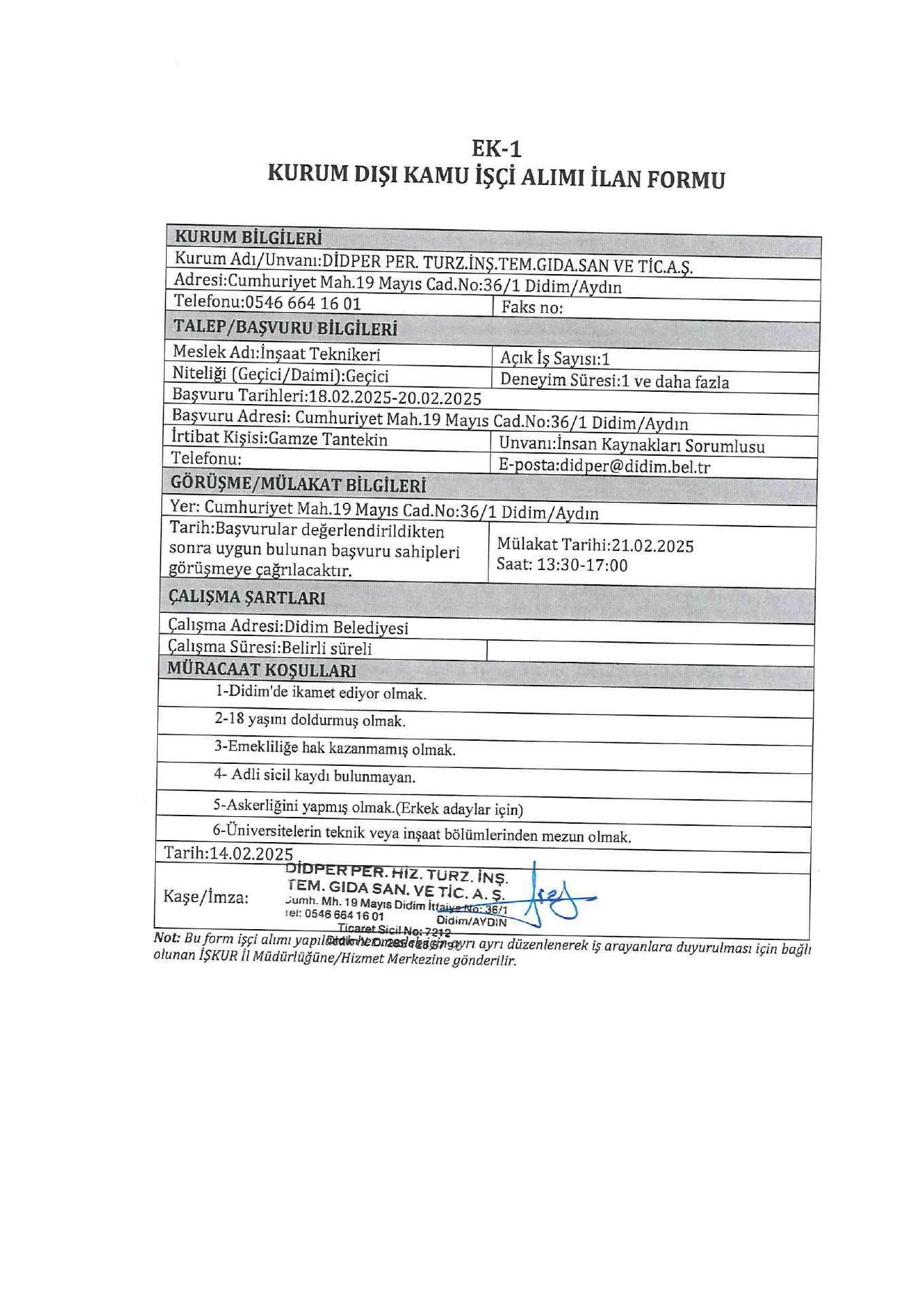 Aydın Didim Didper Geçici 1 İşçi Alacak