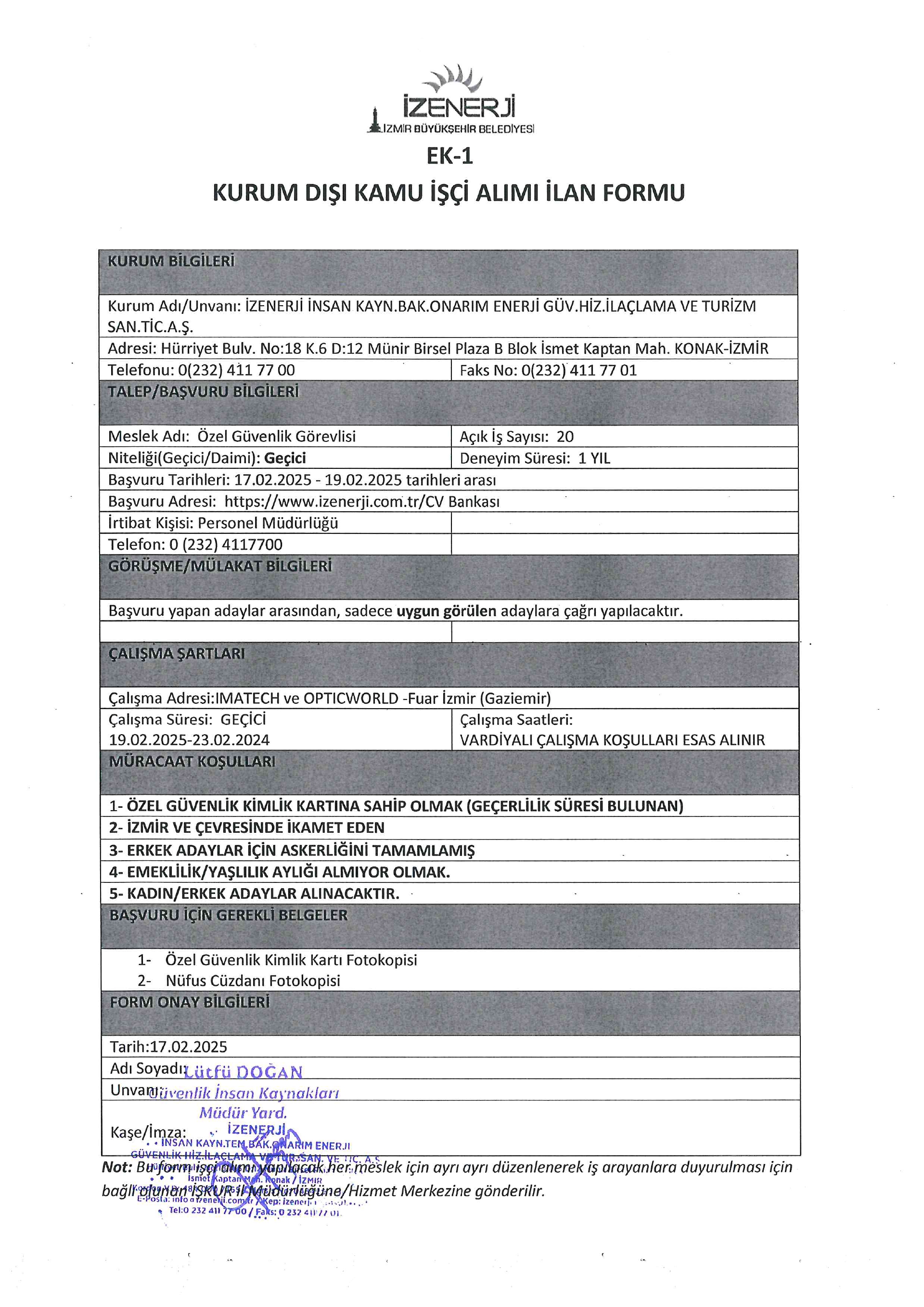 İzmir İzenerji Geçici 20 İşçi Alacak. Son başvuru tarihi 19 şubat 2025