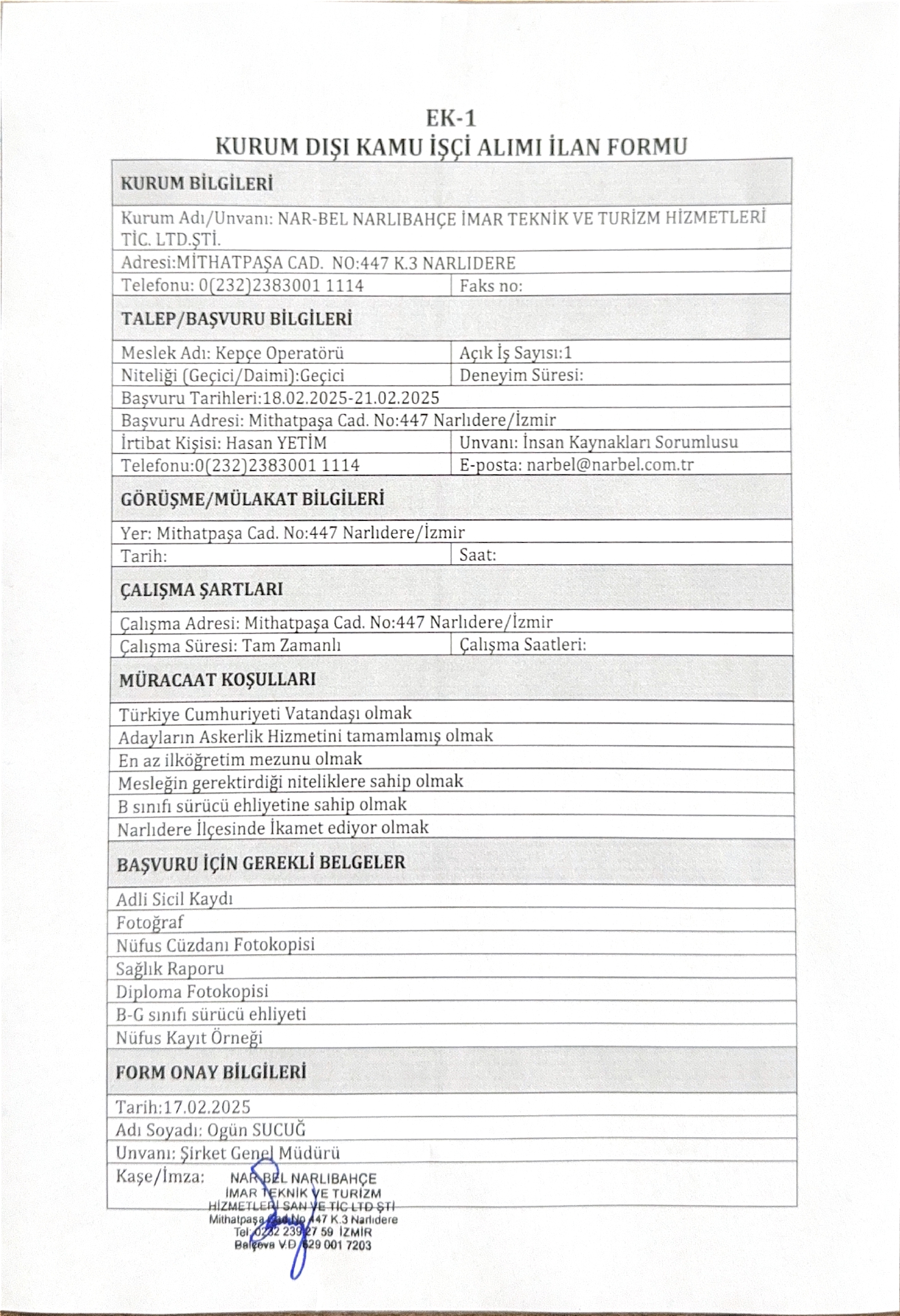 İzmir Nar-Bel Geçici 1 İşçi Alacak. Son başvuru tarihi 21 şubat 2025