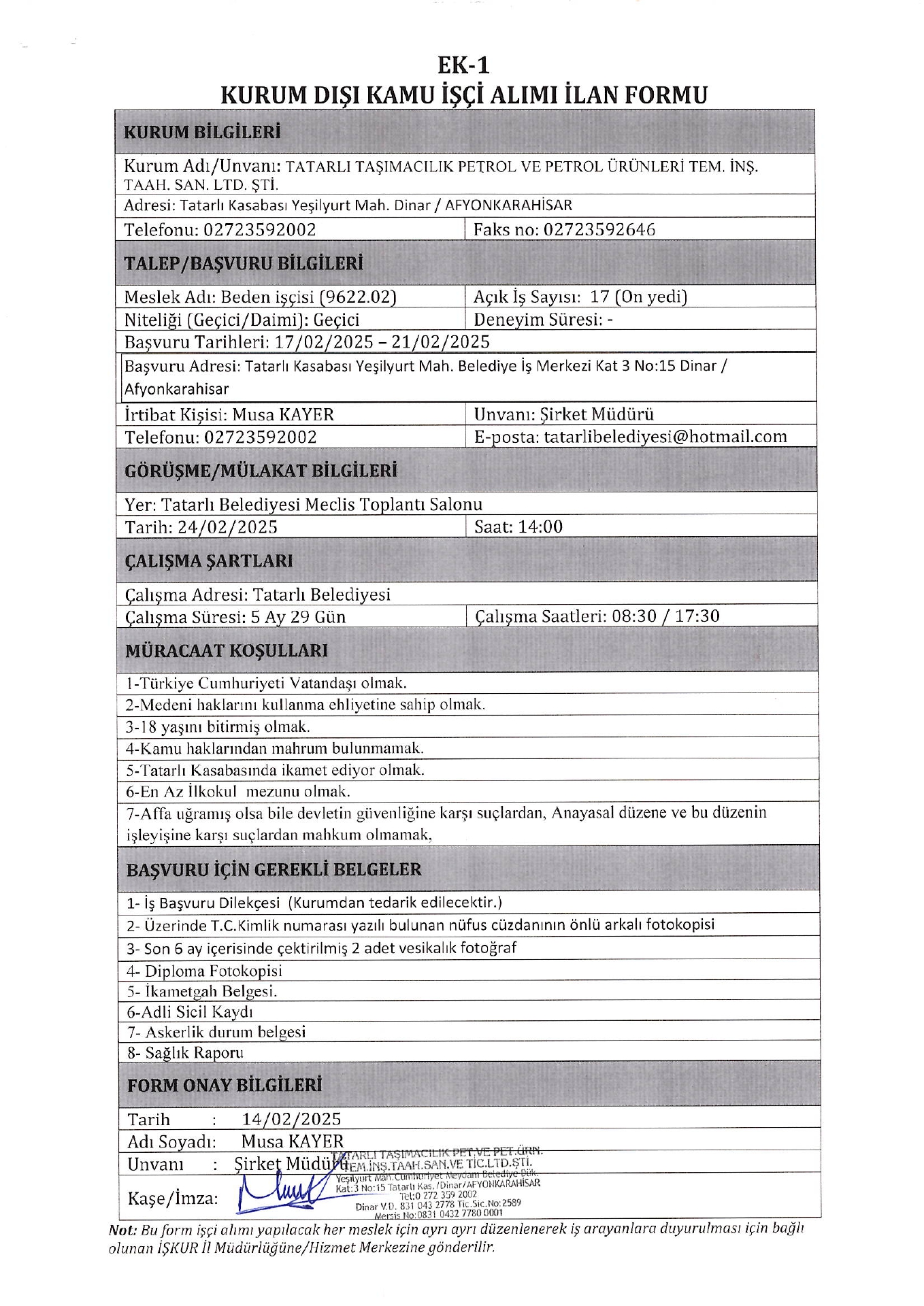 Afyonkarahisar Tatarlı Taşımacılık Geçici 17 İşçi Alacak. Son başvuru tarihi 21 şubat 2025