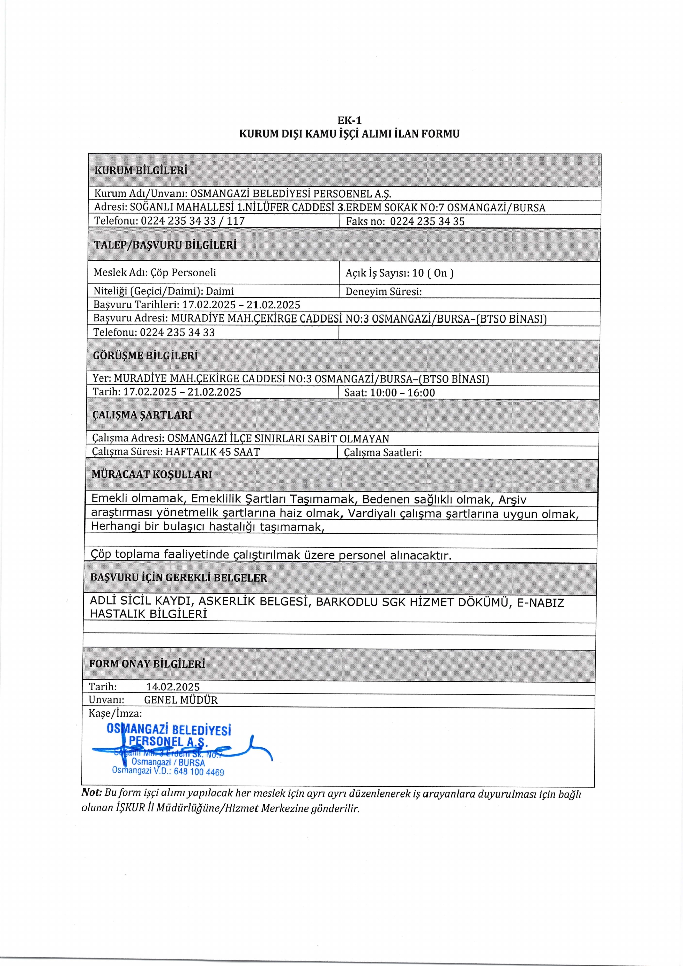 Bursa Osmangazi Belediyesi 10 İşçi Alacak. Son başvuru tarihi 21 şubat 2025