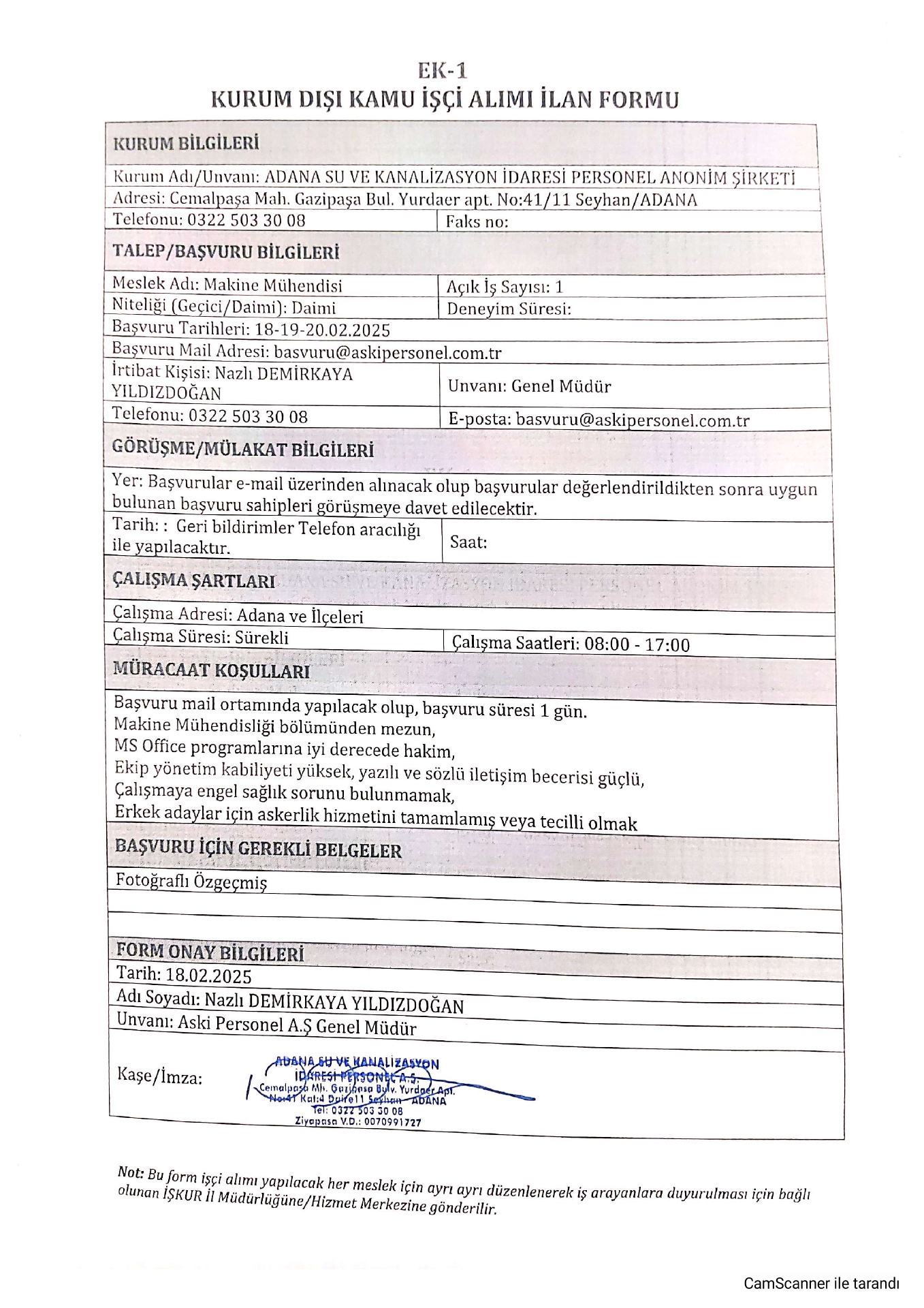 Adana Su ve Kanalizasyon İdaresi 1 İşçi Alacak. Son başvuru tarihi 20 şubat 2025