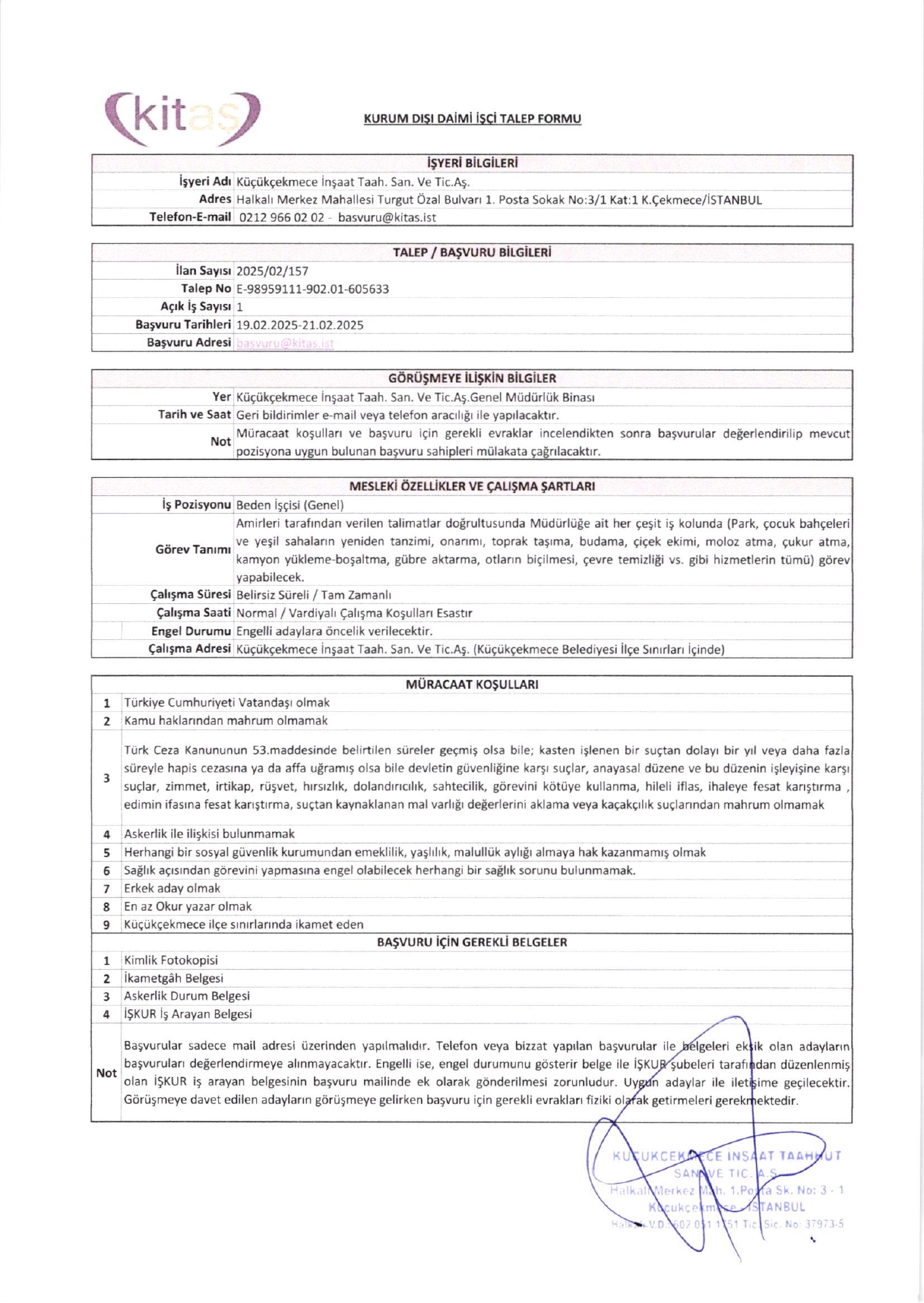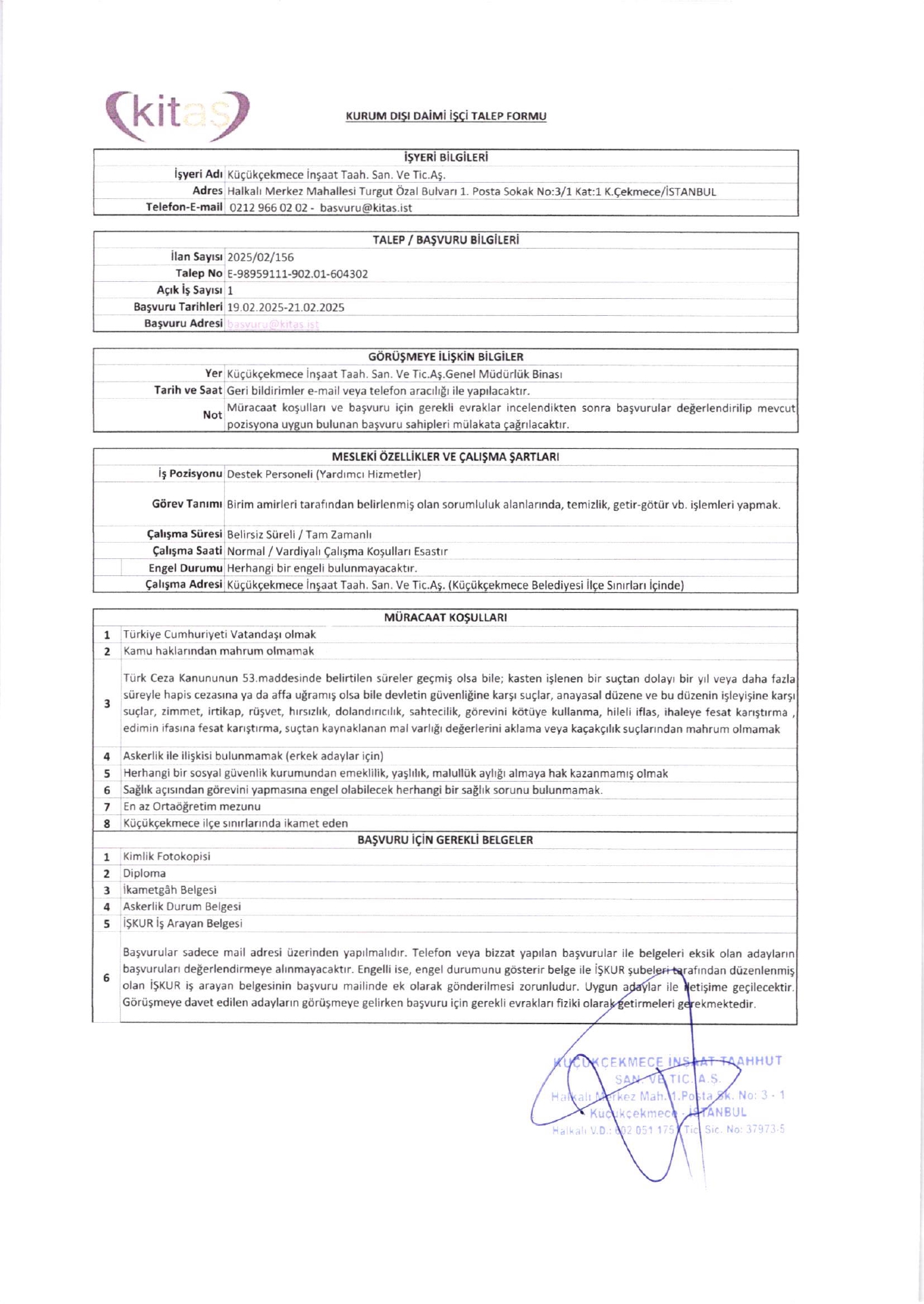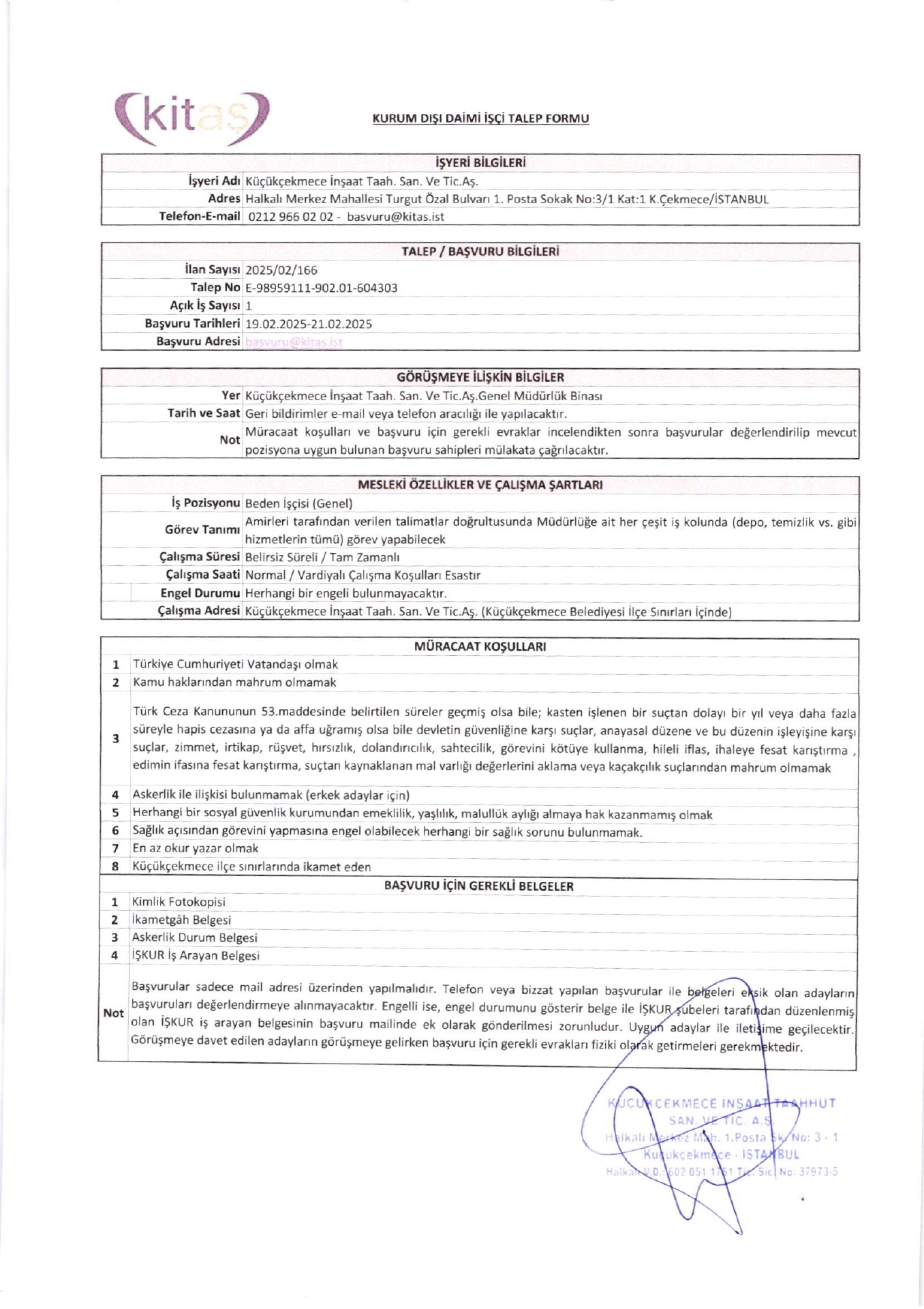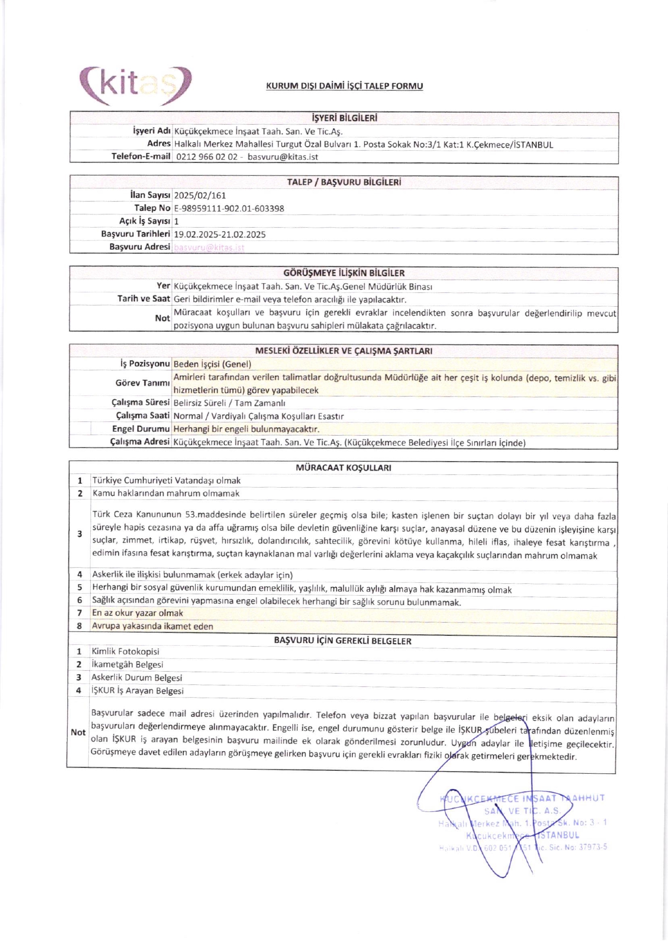 İstanbul Küçükçekmece İnşaat 14 İşçi Alacak. Son başvuru tarihi 21 şubat 2025