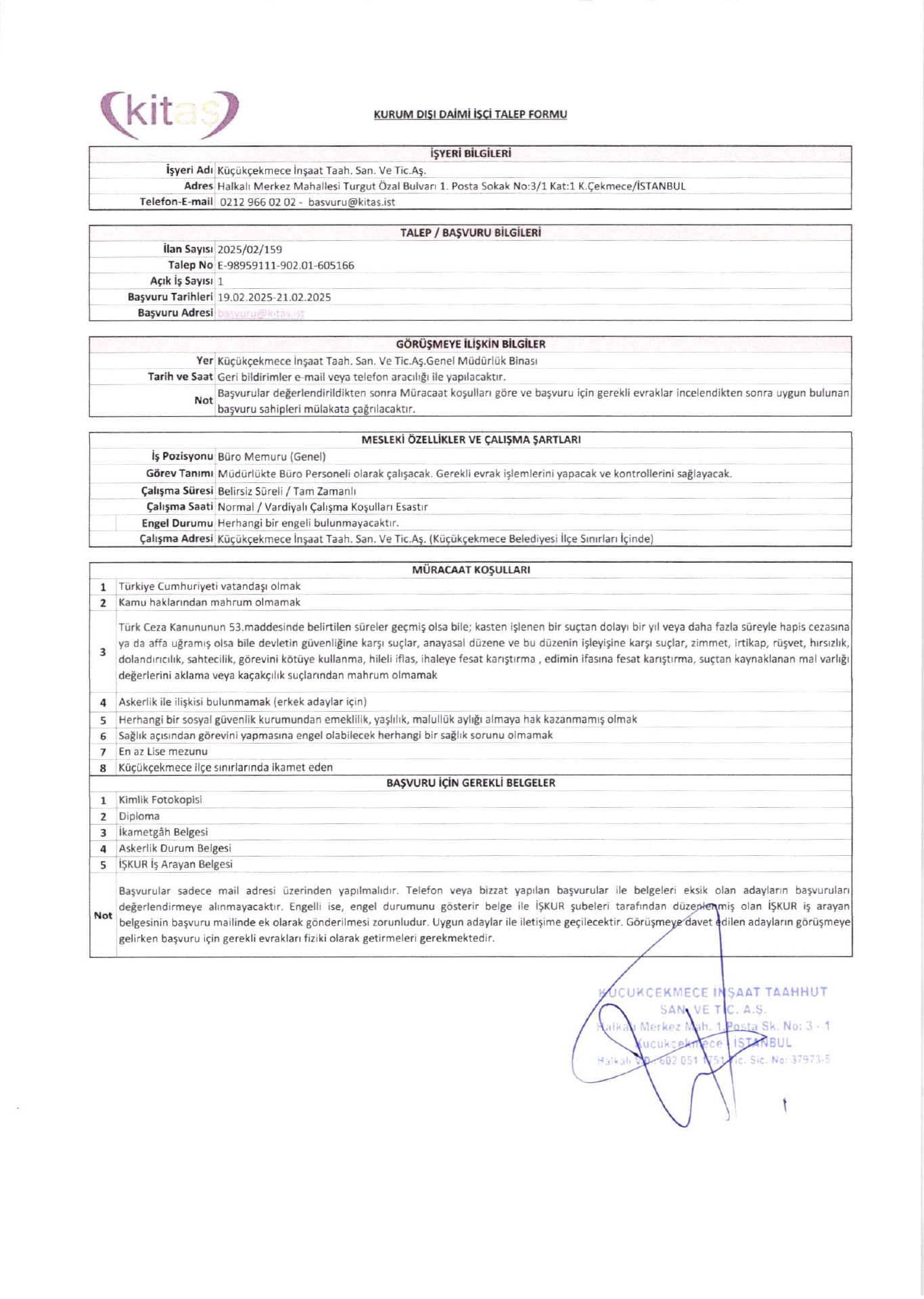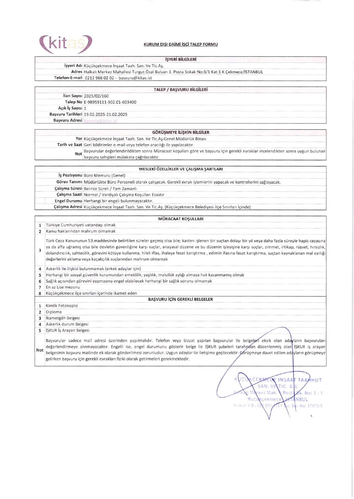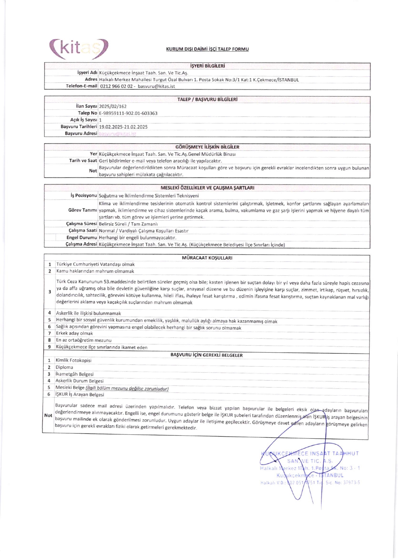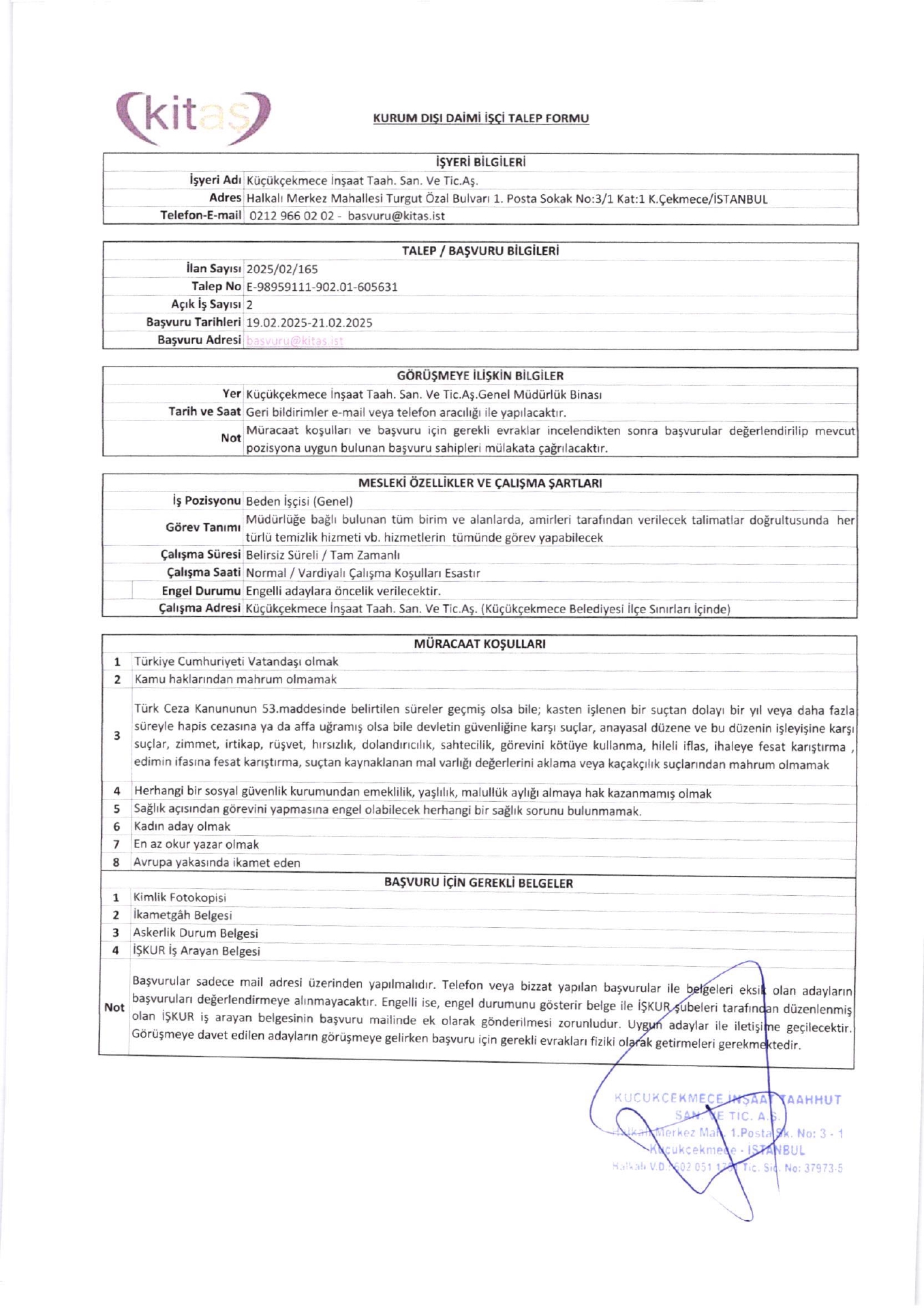 İstanbul Küçükçekmece İnşaat 14 İşçi Alacak. Son başvuru tarihi 21 şubat 2025