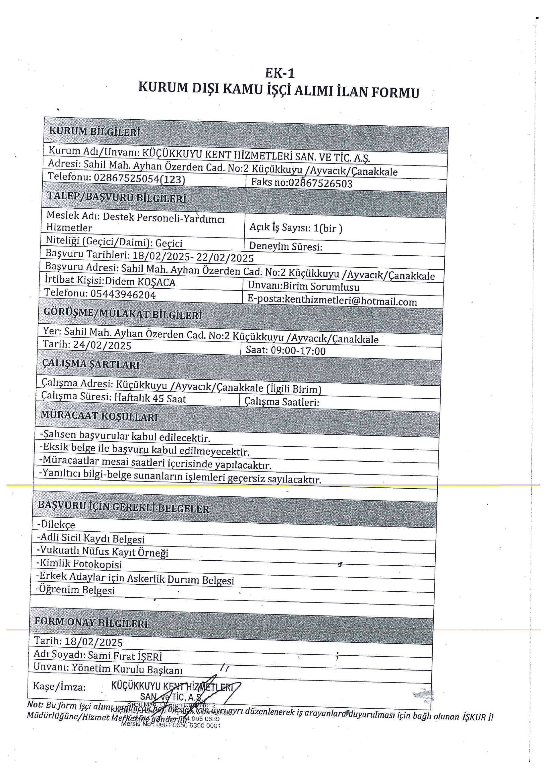 Çanakkale Küçükkuyu Kent Hizmetleri 1 İşçi Alacak. Son başvuru tarihi 22 şubat 2025