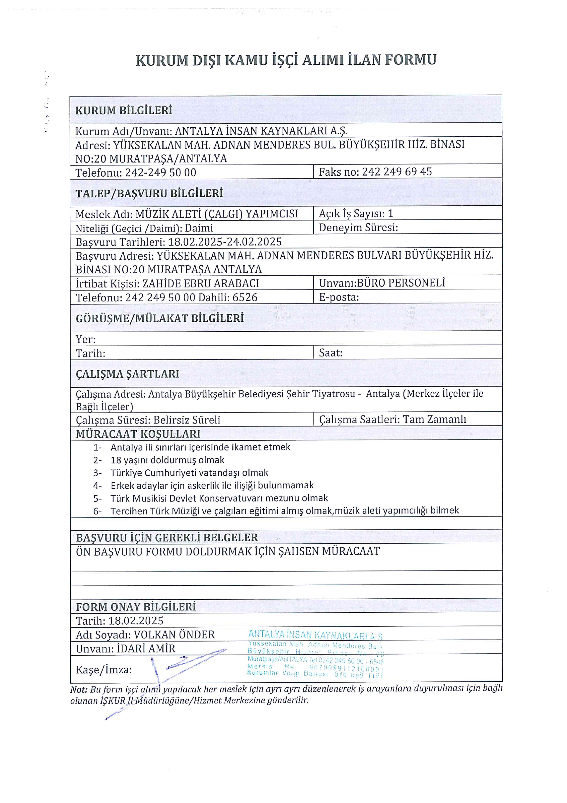Antalya İnsan kaynakları 1 İşçi Alacak. Son başvuru tarihi 24 şubat 2025