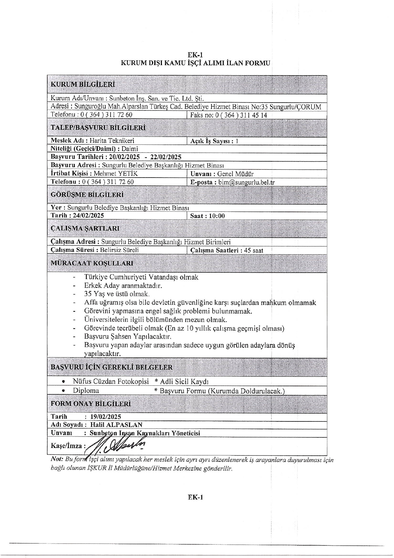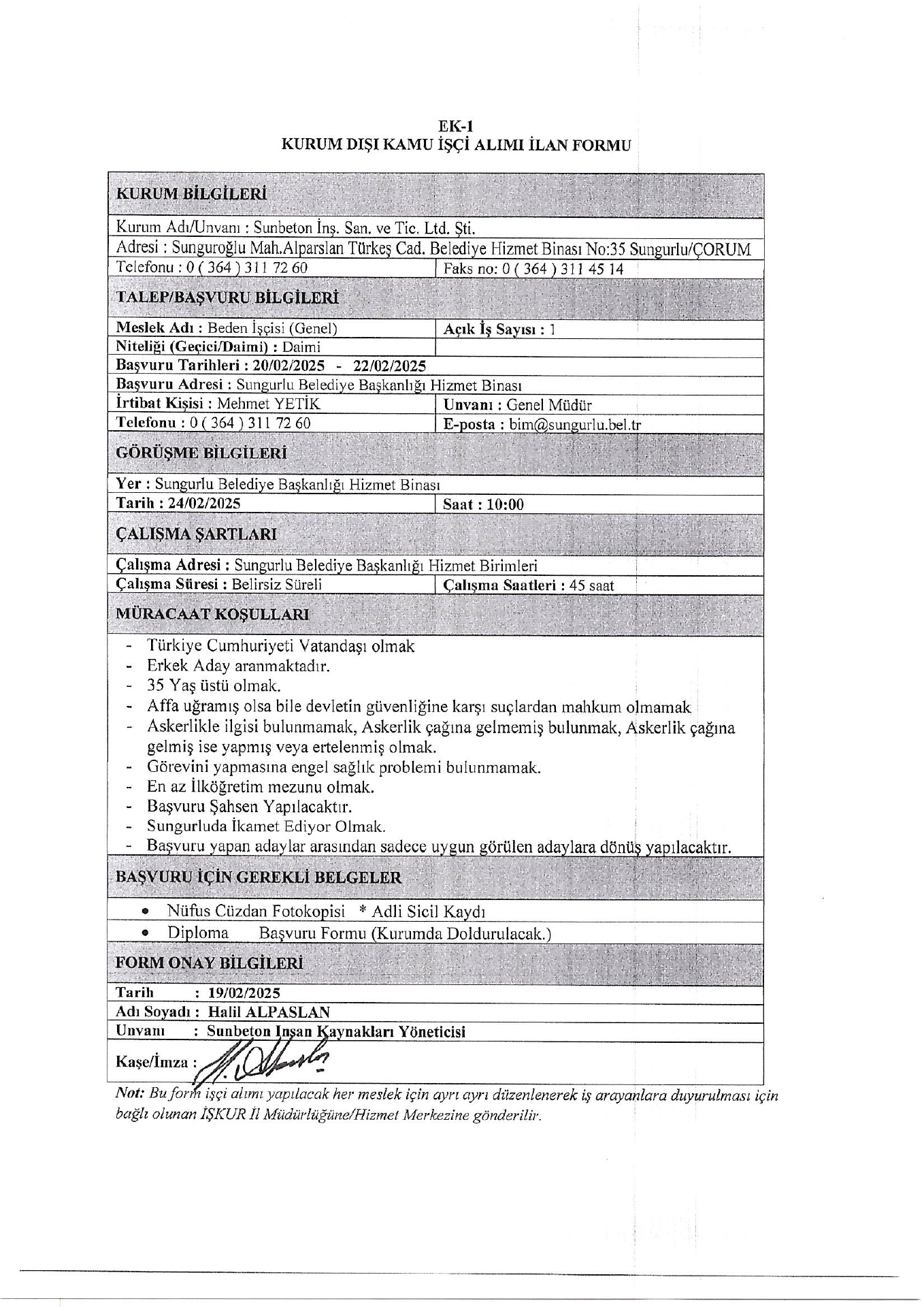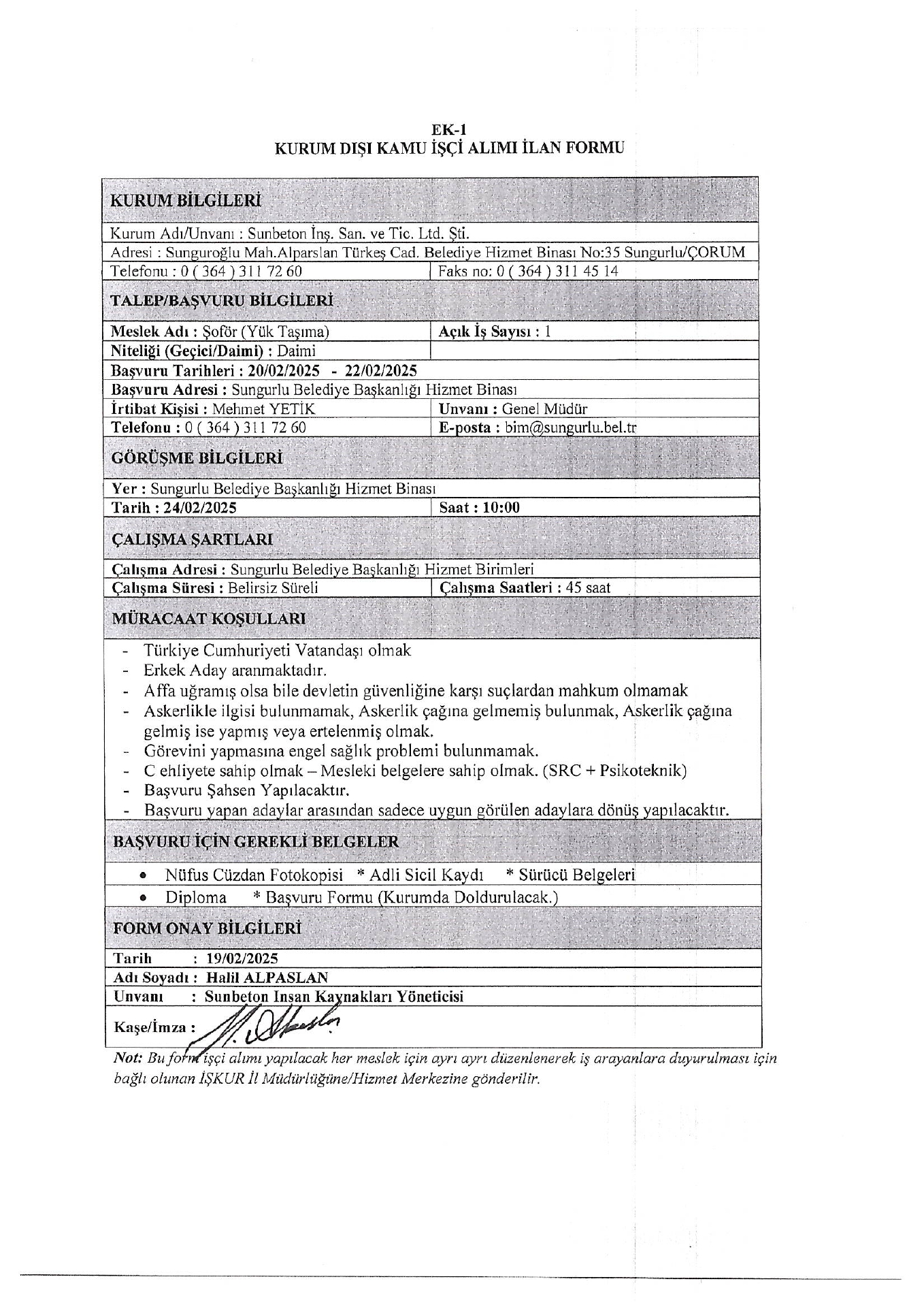 Çorum Sunbeton 3 İşçi Alacak. Son başvuru tarihi 22 şubat 2025