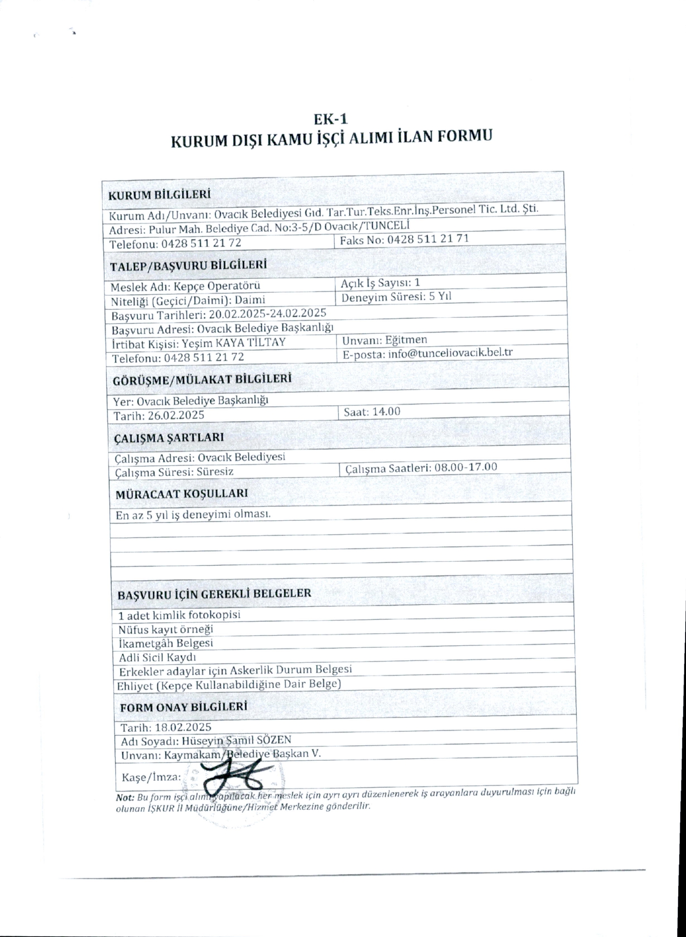 Tunceli Ovacık Belediyesi 1 İşçi Alacak. Son başvuru tarihi 24 şubat 2025