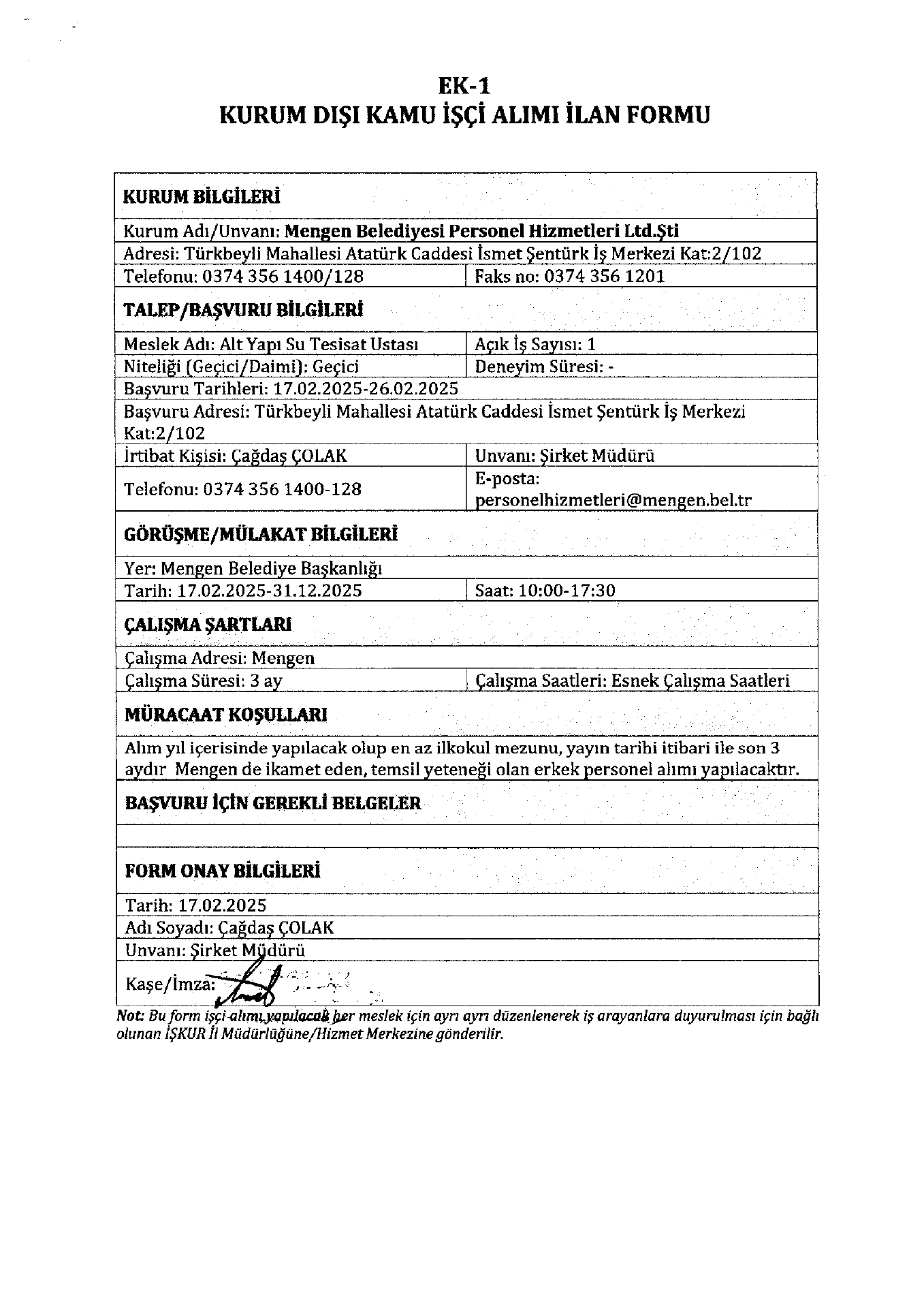Mengen Belediyesi Geçici 1 İşçi Alacak. Son başvuru tarihi 26 şubat 2025