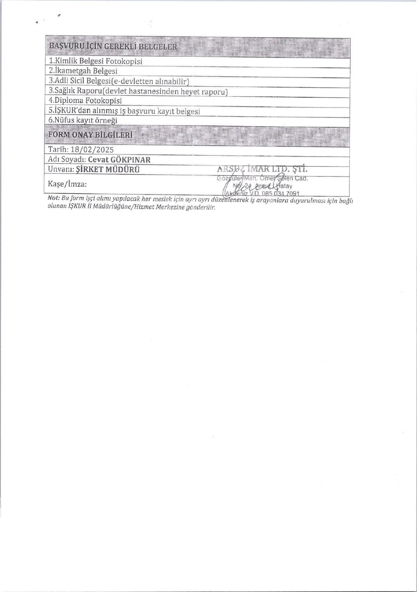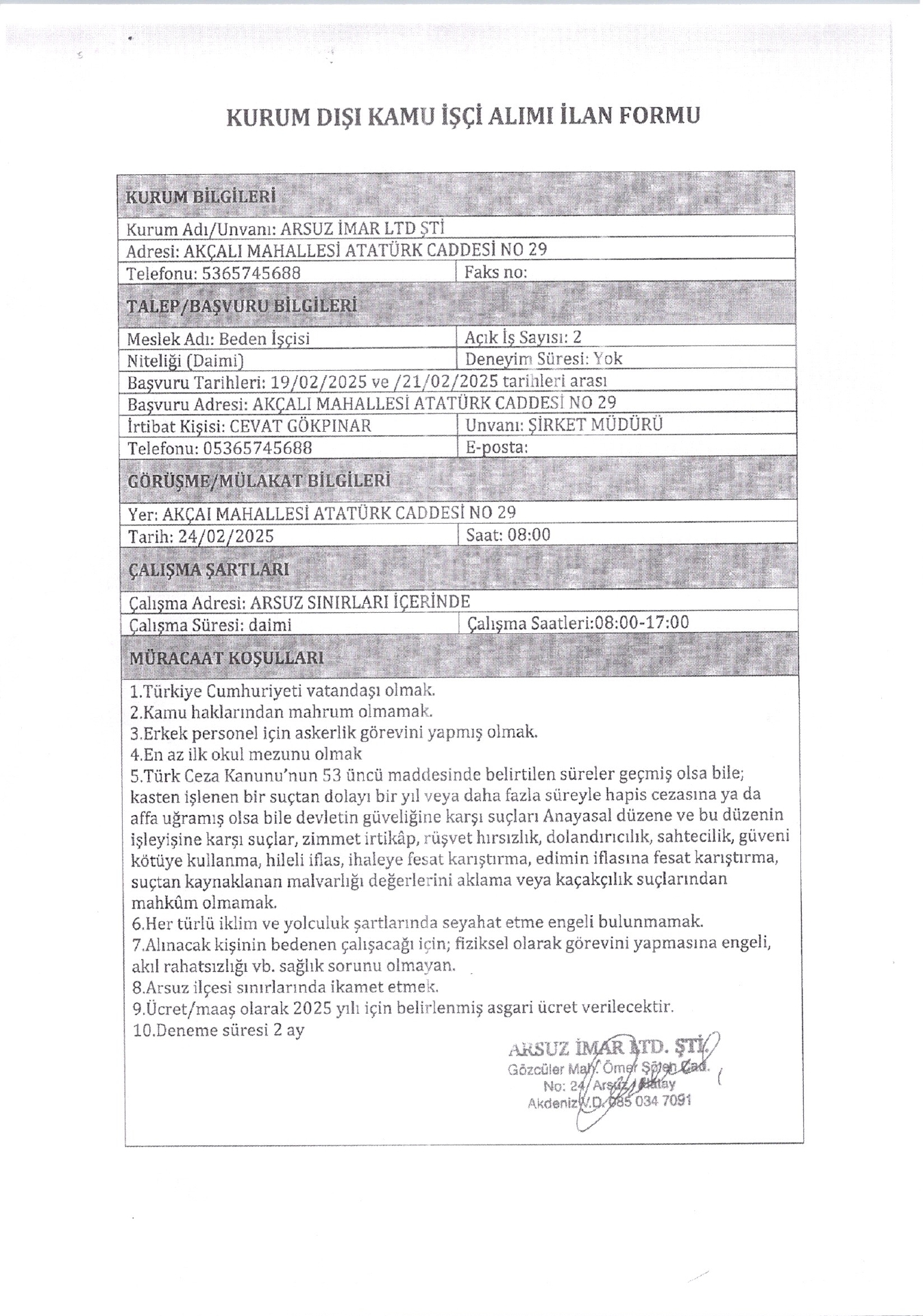Arsuz İmar 1 İşçi Alacak. Son başvuru tarihi 21 şubat 2025