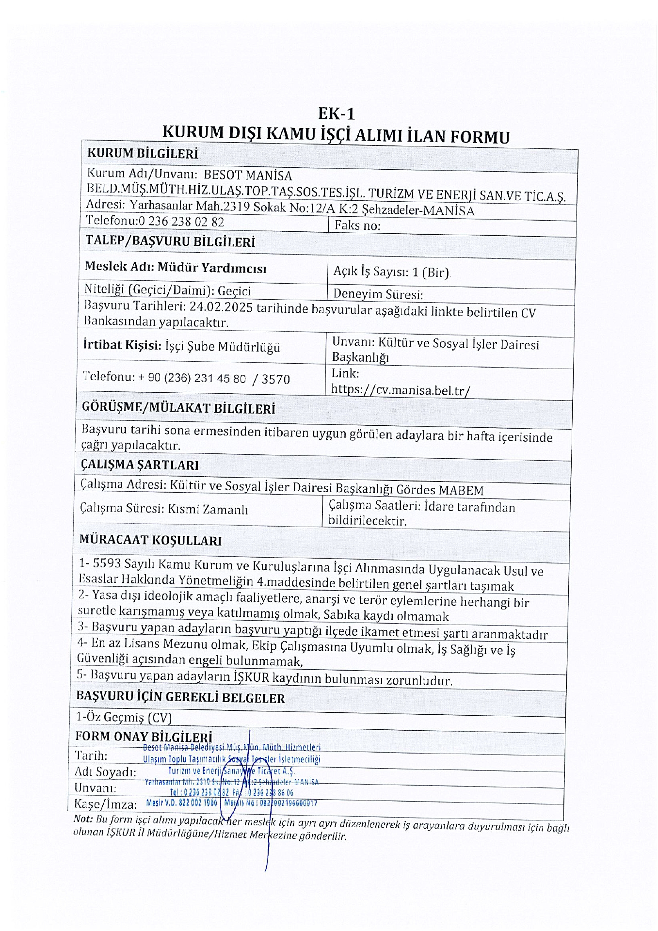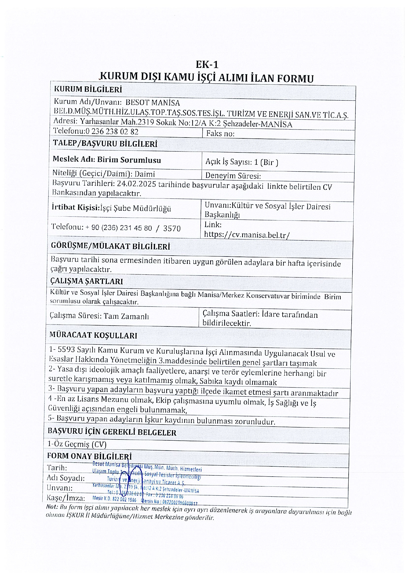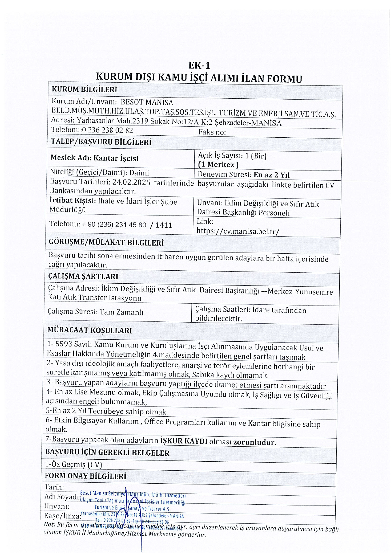 Manisa Besot Geçici 3 İşçi Alacak. Son başvuru tarihi 24 şubat 2025