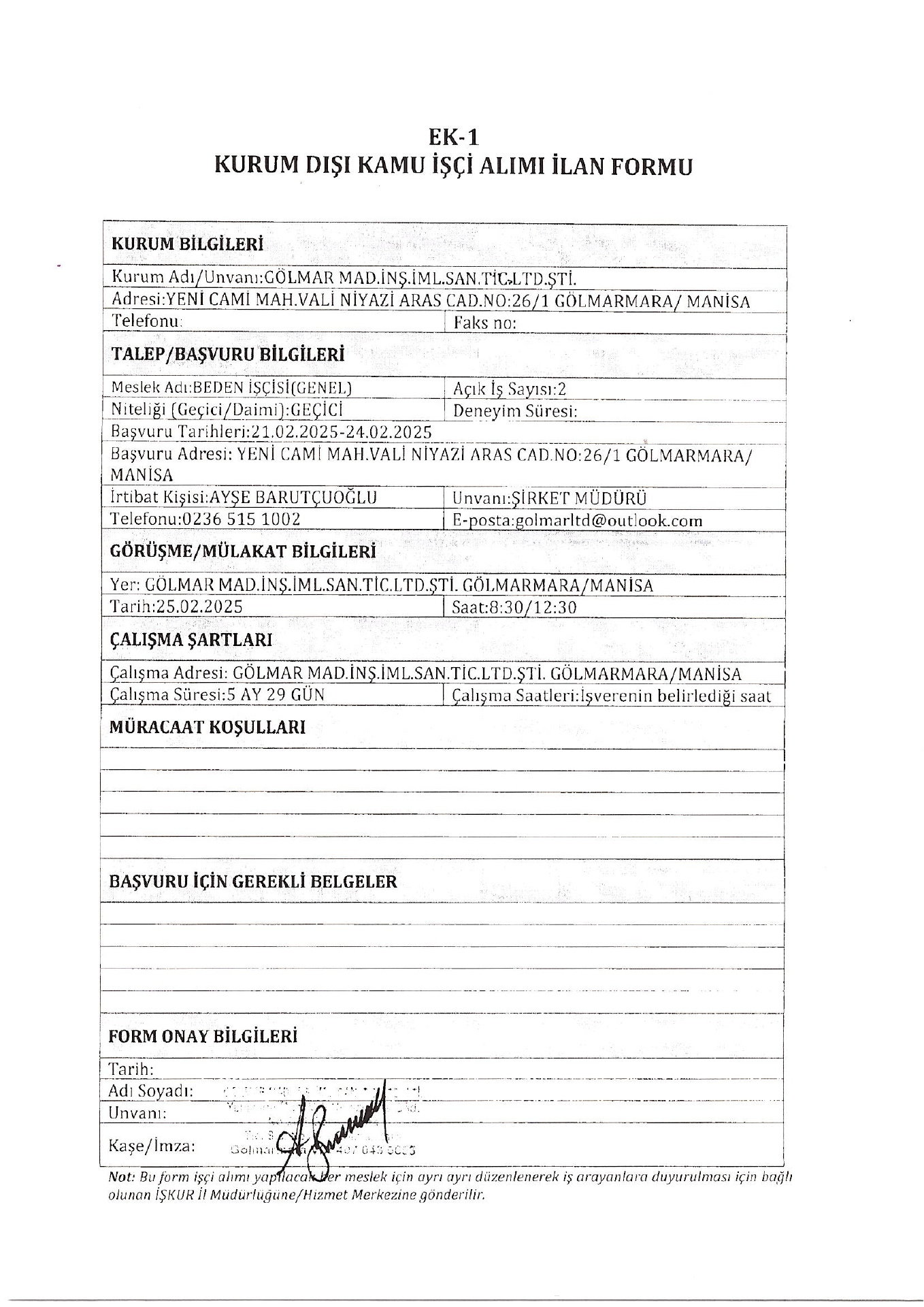 Manisa Gölmar Geçici 2 İşçi Alacak