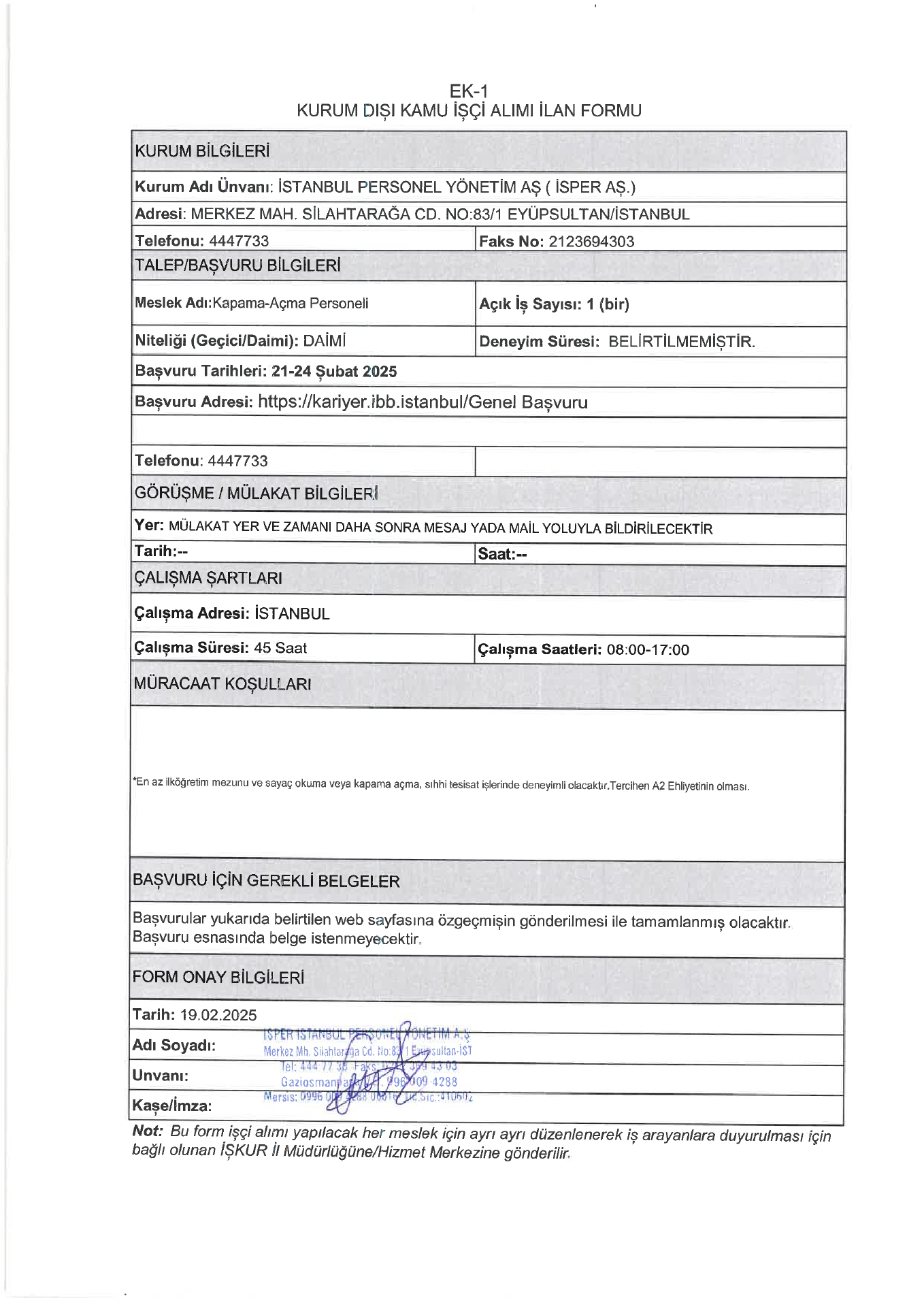 İstanbul Personel Yönetim Aş. 1 İşçi Alacak. Son başvuru tarihi 24 şubat 2025