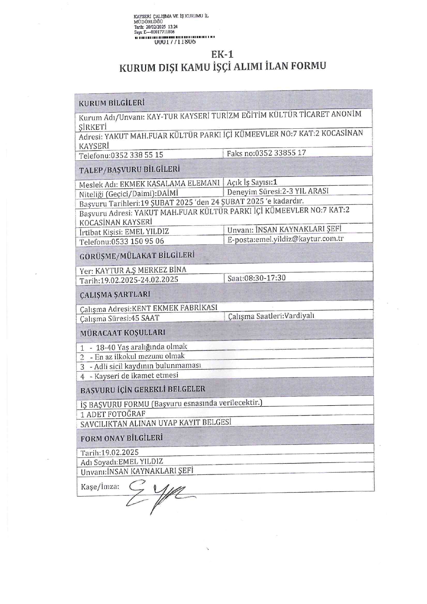 Kayseri Kay-Tur 1 İşçi Alacak. Son başvuru tarihi 24 şubat 2025