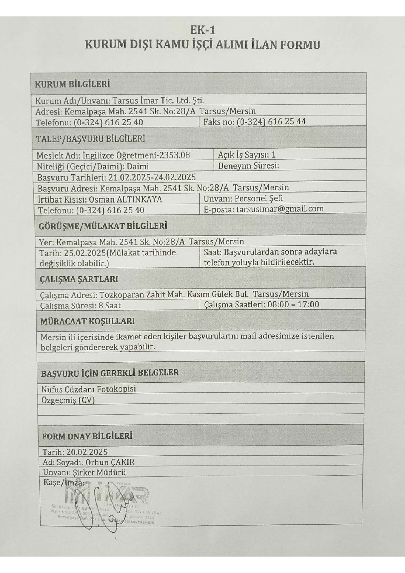 Mersin Tarsus İmar 1 İşçi Alacak Son başvuru tarihi 24 şubat 2025