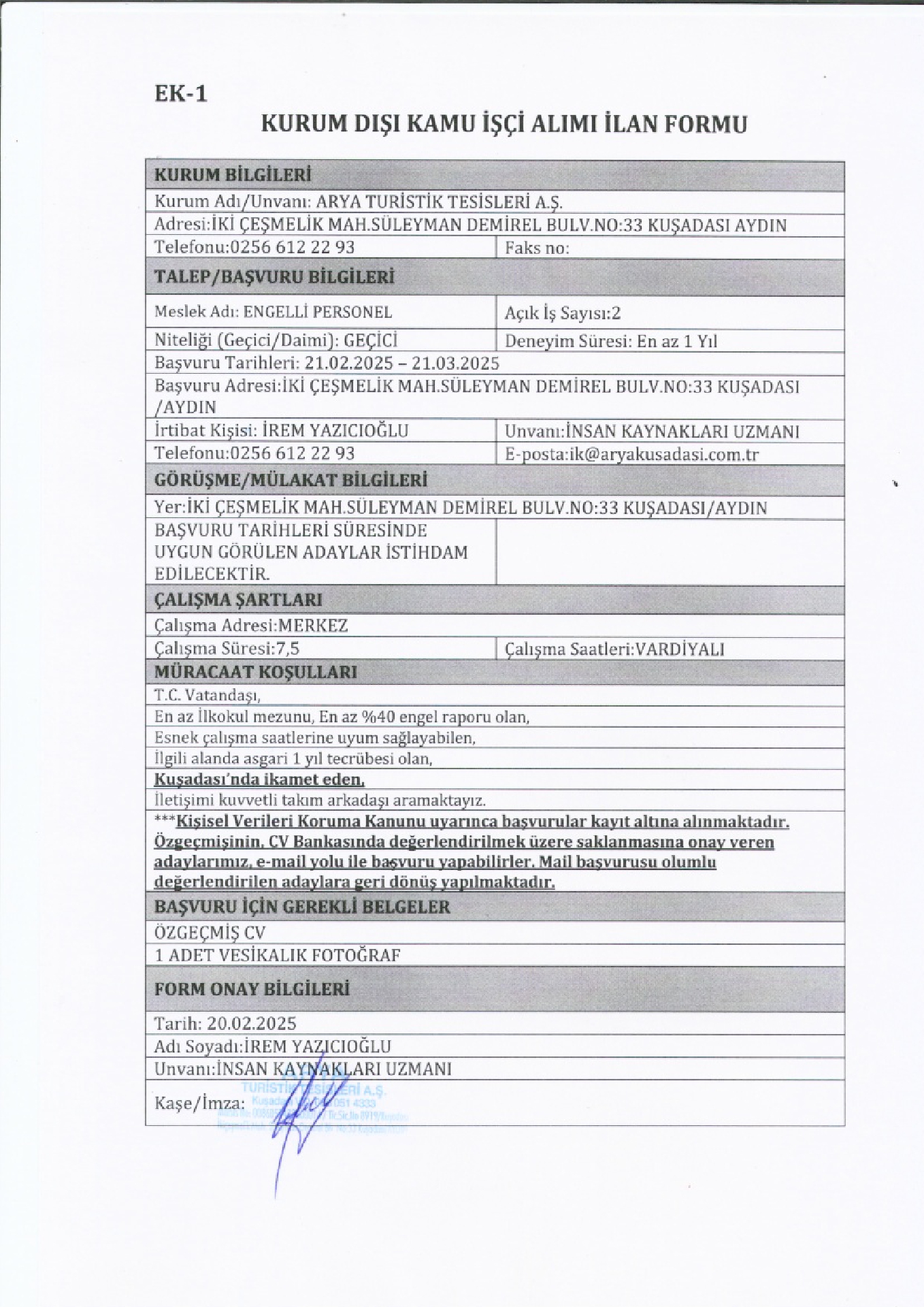 Aydın Arya Turistik Geçici 2 İşçi Alacak. Son başvuru tarihi 21 mart 2025