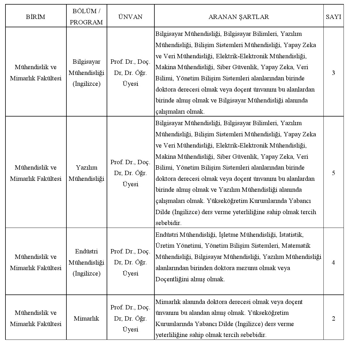 Üniversitemiz çeşitli bölümlerine 2547 sayılı Yükseköğretim Kanunu ve Öğretim Üyeliğine Yükseltilme ve Atama Yönetmeliğinin ilgili maddelerine göre öğretim üyeleri (profesör, doçent, doktor öğretim üyesi) ve 09.11.2018 tarihli 30590 sayılı Resmi Gazete'de yayınlanan "Öğretim Üyesi Dışındaki Öğretim Elemanı Kadrolarına yapılacak Atamalarda Uygulanacak Merkezi Sınav ile Giriş Sınavlarına İlişkin Usul ve Esaslar Hakkında Yönetmelik" hükümleri uyarınca, Öğretim Görevlisi ve Araştırma Görevlisi alınacaktır.