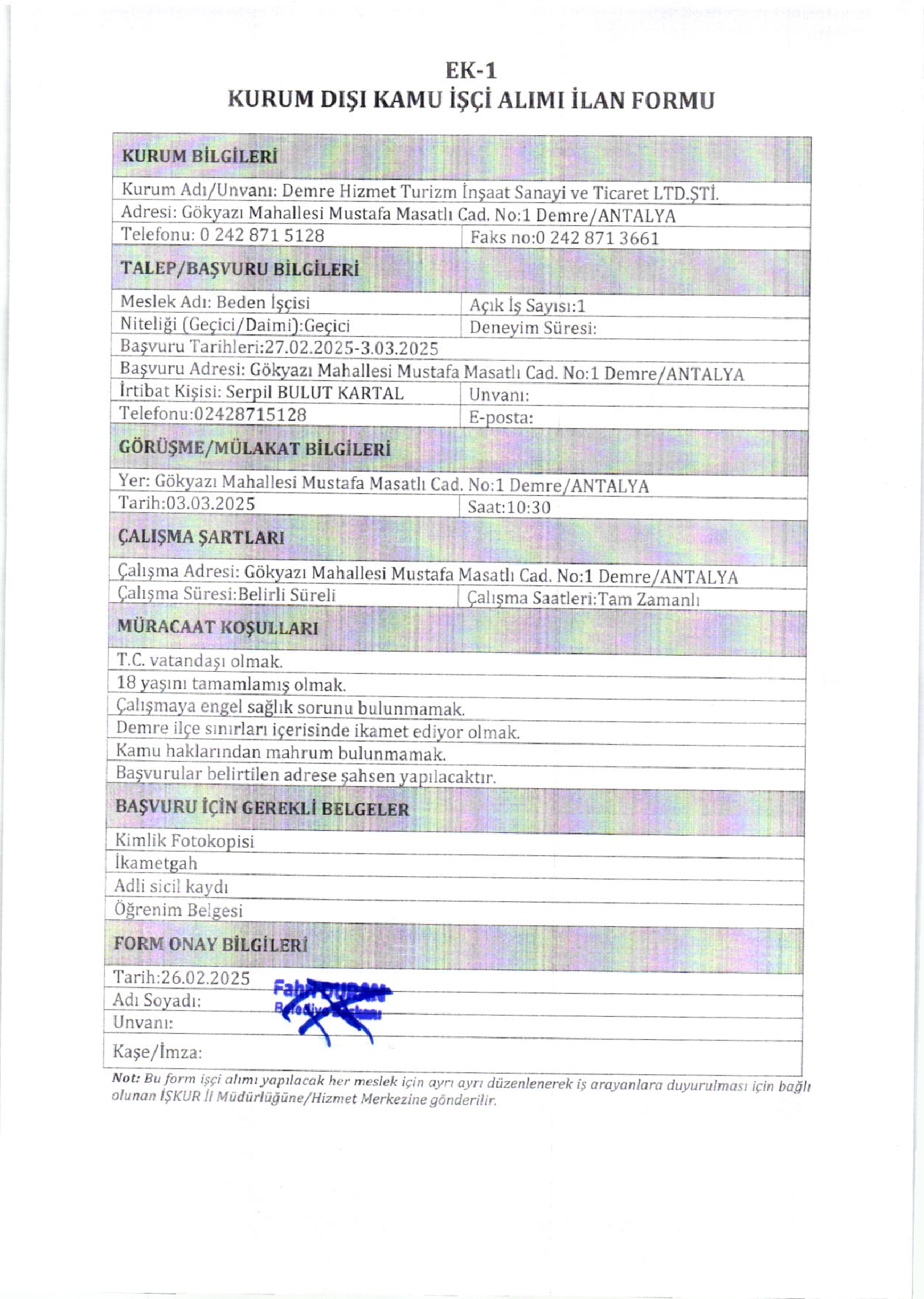 Antalya Demre Hizmet Geçici 1 İşçi Alacak. Son başvuru tarihi 03 mart 2025