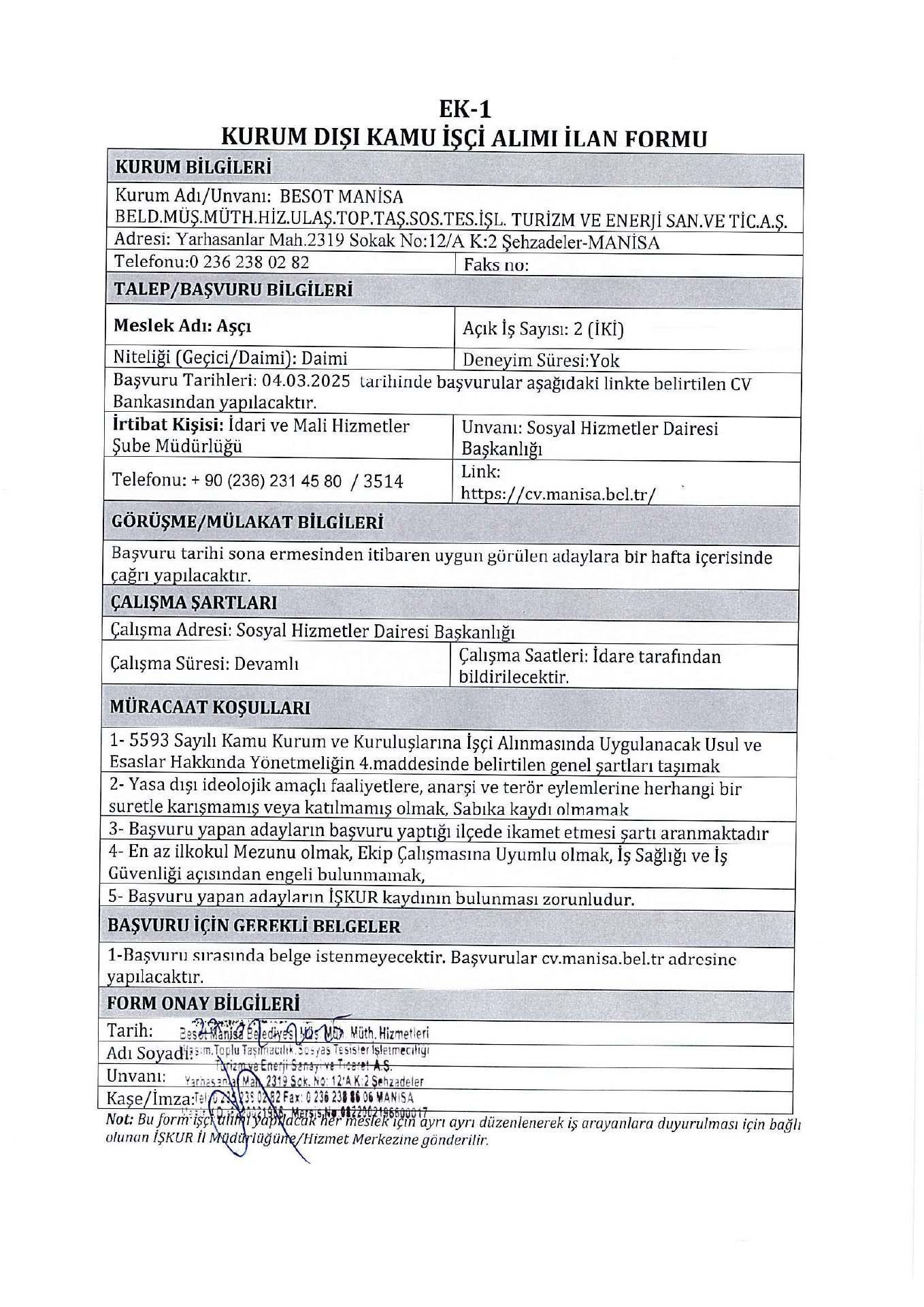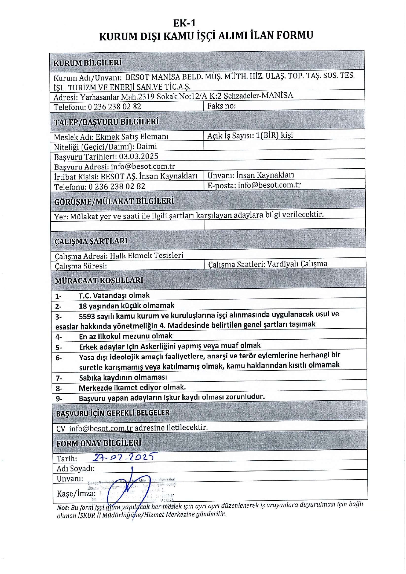 Manisa Besot 3 İşçi Alacak. Son başvuru tarihi 04 mart 2025