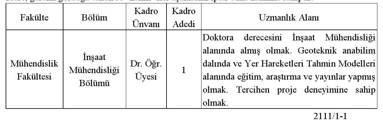 Üniversitemiz ilgili Birimlerine 2547 sayılı Kanun ile bu Kanuna dayanılarak Yükseköğretim Kurulu Başkanlığı'nca 12.06.2018 tarih ve 30449 sayılı Resmi Gazete'de yayımlanan "Öğretim Üyeliğine Yükseltilme ve Atanma Yönetmeliği", Üniversitemiz resmi erişim sayfasında yayımlanan "Akademik Kadrolara Atama ve Yükseltmeler Hakkında Yönerge"de belirtilen kıstasları yerine getirmiş olmak kaydıyla ilgili alanlarda uzmanlaşmış öğretim üyesi alınacaktır.