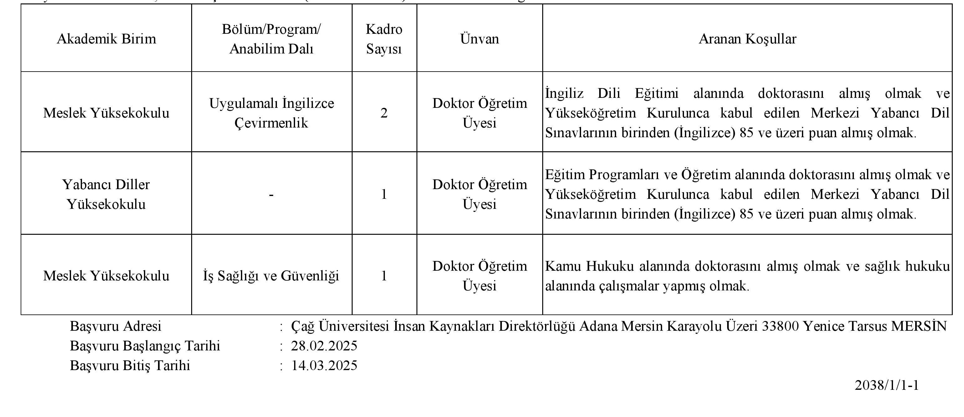 Üniversitemize 2547 sayılı Yükseköğretim Kanununu ve Öğretim Üyesi Dışındaki Öğretim Elemanı Kadrolarına Yapılacak Atamalarda Uygulanacak Merkezi Sınav ile Giriş Sınavlarına İlişkin Usul ve Esaslar Hakkında Yönetmelik uyarınca aşağıda belirtilen kadrolara tam gün statüde çalışacak öğretim elemanları alınacaktır. Başvurular aşağıda belirtilen son başvuru tarihine kadar istenen belgelerle birlikte Çağ Üniversitesi İnsan Kaynakları Direktörlüğüne şahsen veya posta aracılığı ile yapılabilir. Postadaki gecikmeler ve eksik belge ile yapılan başvurular dikkate alınmaz. İnternet üzerinden başvurular kabul edilmez.