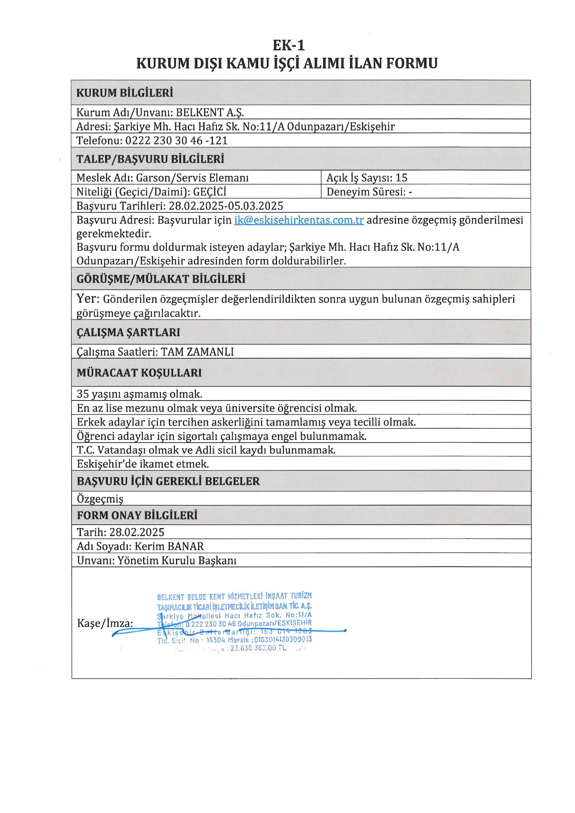 Eskişehir Belkent Geçici 15 İşçi Alacak. Son başvuru tarihi 05 mart 2025