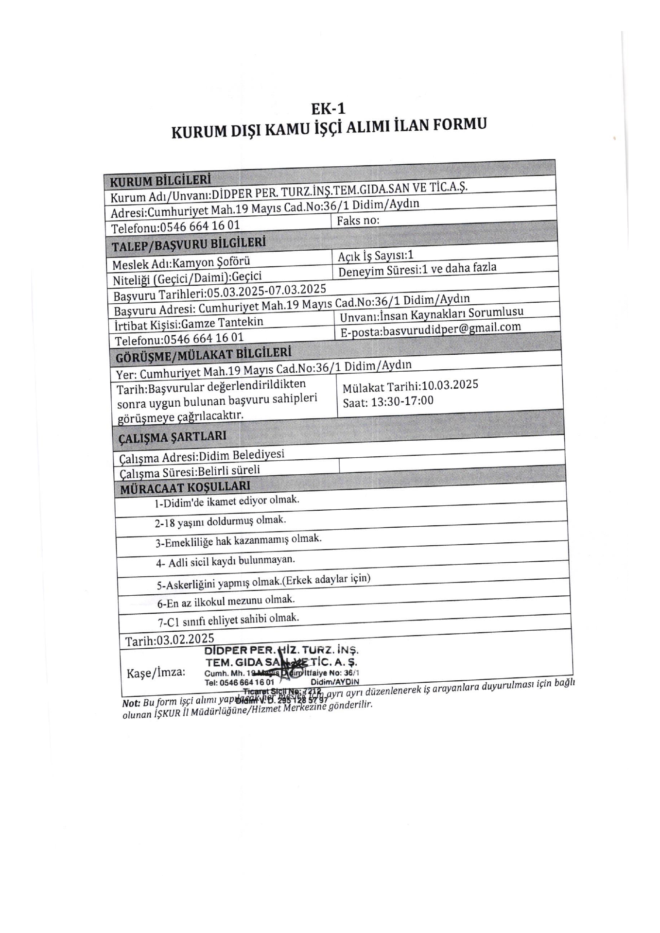 Aydın Didper Geçici 1 İşçi Alacak. Son başvuru tarihi 07 mart 2025