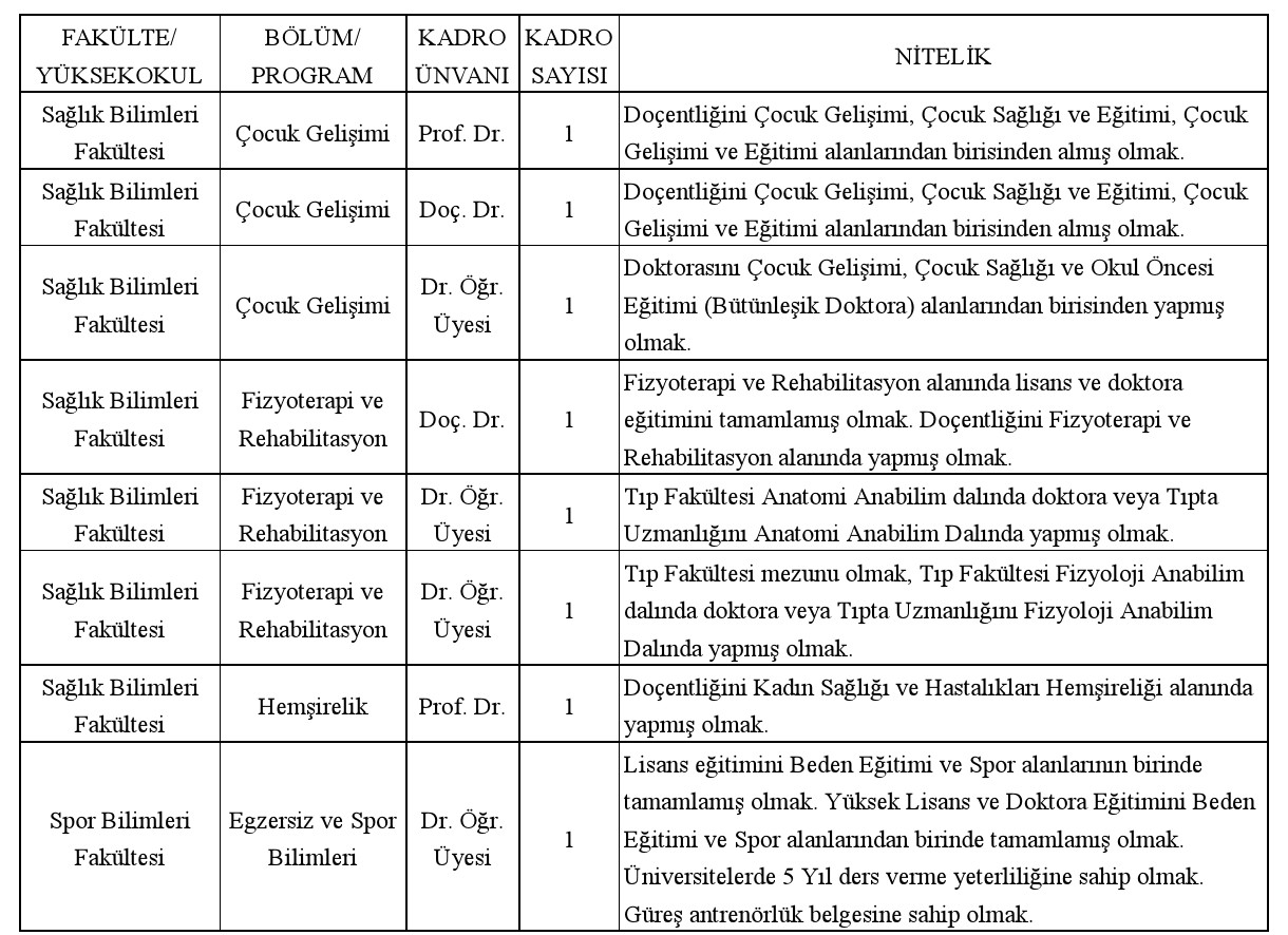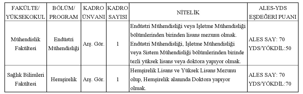Üniversitemize 2547 sayılı Yükseköğretim Kanunu'nun ve Öğretim Üyesi Dışındaki Öğretim Elemanı Kadrolarına Yapılacak Atamalarda uygulanacak Merkezi Sınav ile Giriş Sınavlarına İlişkin Usul ve Esaslar Hakkında Yönetmelik gereğince öngörülen koşulları sağlamış olmak şartı ile aşağıda belirtilen kadrolara öğretim elemanı alınacaktır.