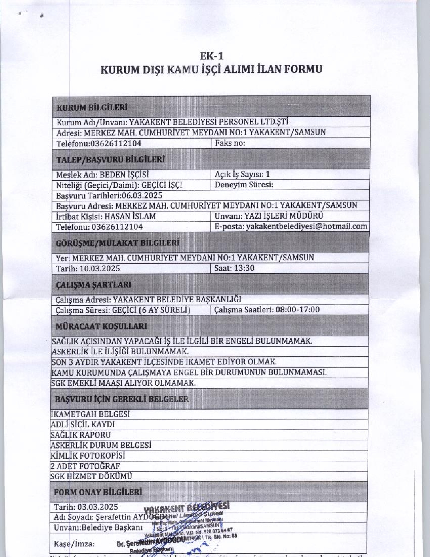 Samsun Yakakent Belediyesi Geçici 1 İşçi Alacak. Son başvuru tarihi 06 mart 2025