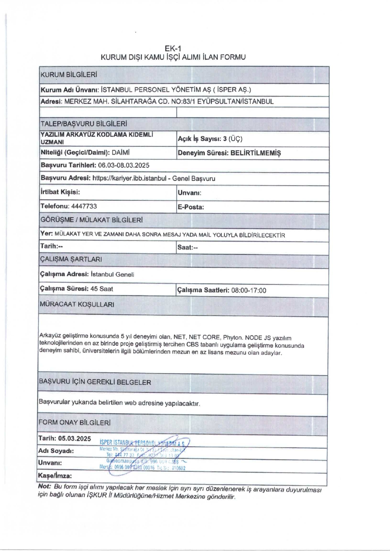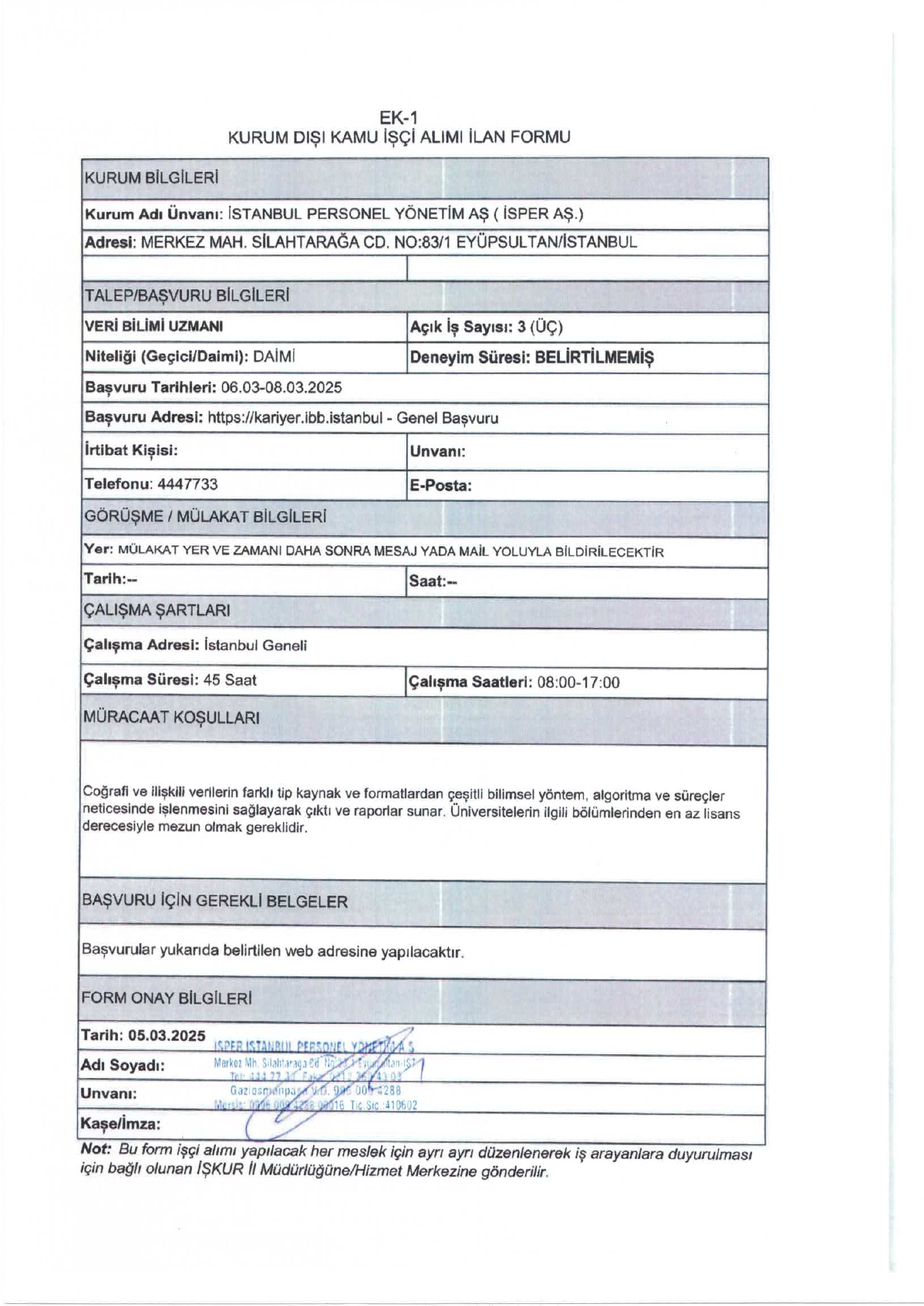 İstanbul Personel Yönetim Aş. 6 İşçi Alacak. Son başvuru tarihi 08 mart 2025