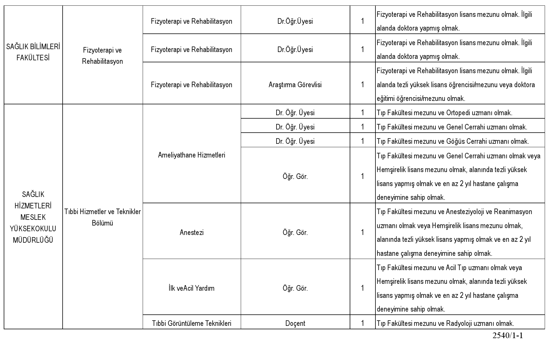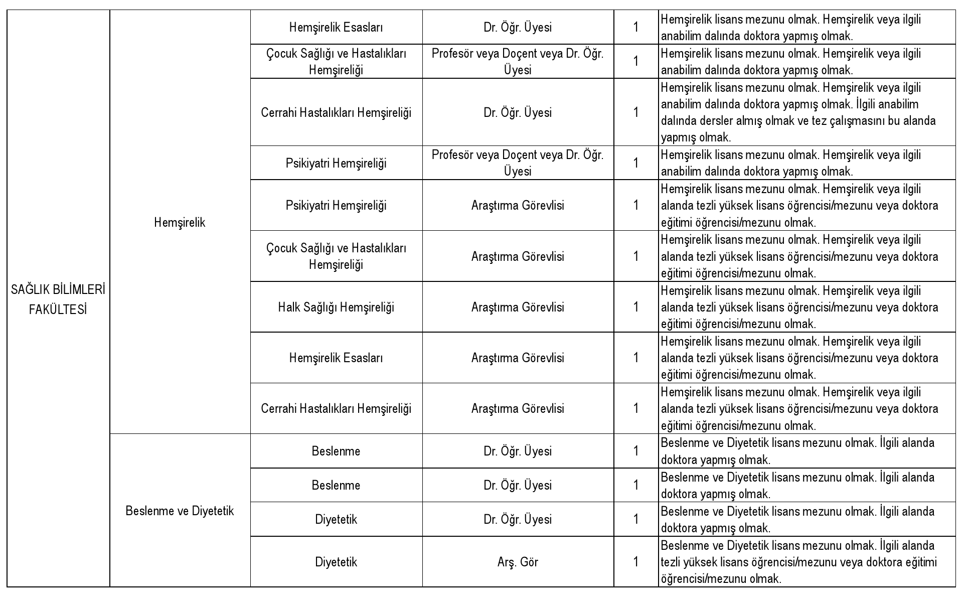 İletişim bilgilerini içeren başvuru dilekçesi, resimli özgeçmiş, iki (2) adet fotoğraf, diploma belgelerinin aslı veya noter onaylı sureti veya İnsan Kaynakları Müdürlüğümüz tarafından aslı görülerek onaylanan suretleri, onaylı lisans ve tezli yüksek lisans belgeleri, lisans transkripti, Tıp Fakültesi mezunu olmayan adaylardan, ALES'den en az 70, SHMYO Öğretim görevlileri başvuruları için Yükseköğretim Kurulu tarafından kabul edilen Merkezi Yabancı Dil Sınavından en az 50 puan veya eşdeğerliliği kabul edilen bir sınavdan bu puan muadili bir puan aldığını gösteren yabancı dil sınav sonuç belgesi.