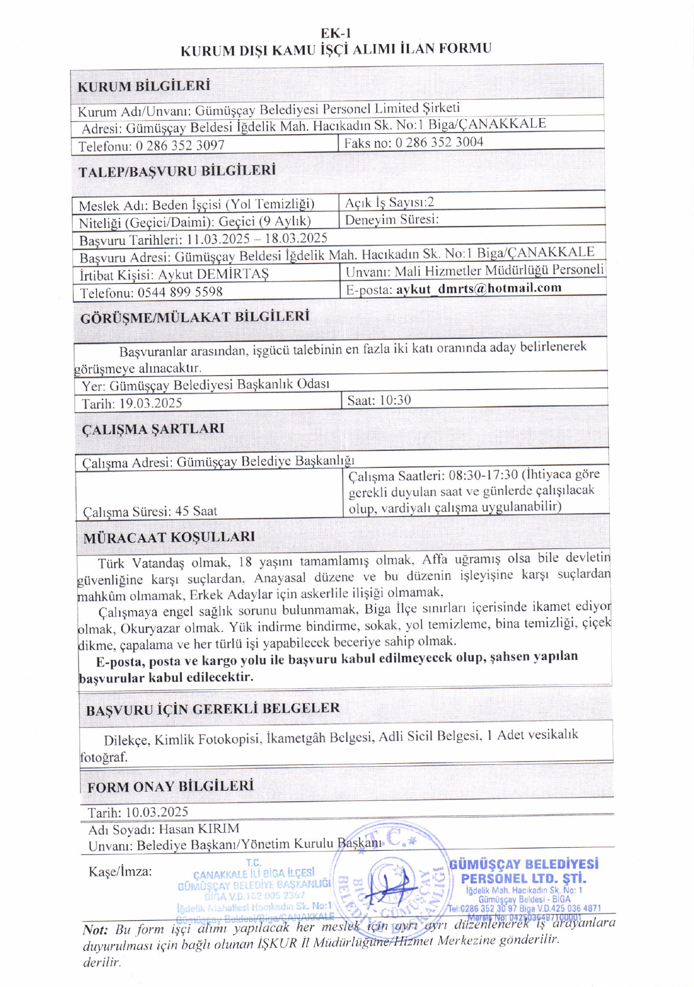 Çanakkale Gümüşçay Belediyesi Geçici 2 İşçi Alacak. Son başvuru tarihi 18 mart 2025